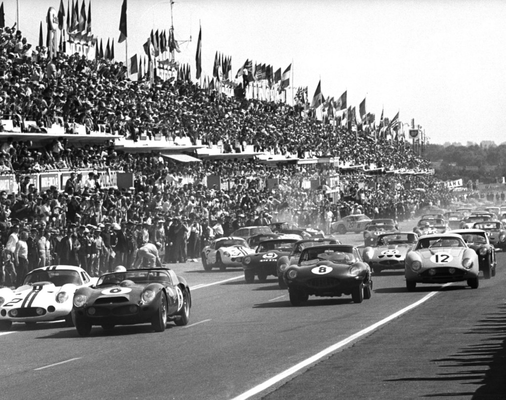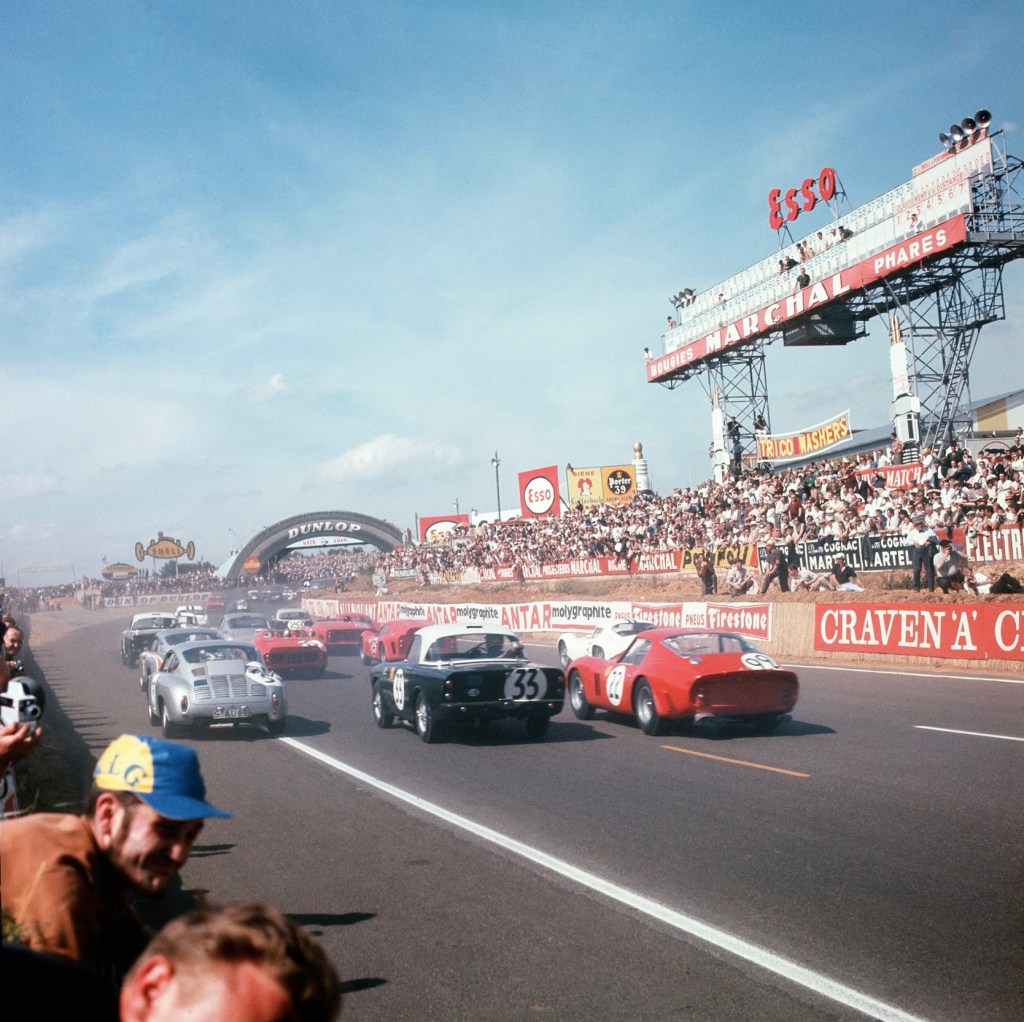 The off, Le Mans 1962. From left, the McLaren/Hansgen Maserati T151 Coupe, the winning Gendebien/Hill Ferrari 330 TRI/LM, #3 white Kimberley/Thompson Maserati T151 Coupe, #9 Sargent/Lumsden Jaguar E-Type Coupe Lwt, #23 Tavano/Simon Ferrari 250 GTO and #12 Kerguen/Dewez Aston Martin DB4 GT Zagato (MotorSport)Phil Hill up, #0808 Le Mans 1962 (MotorSport)