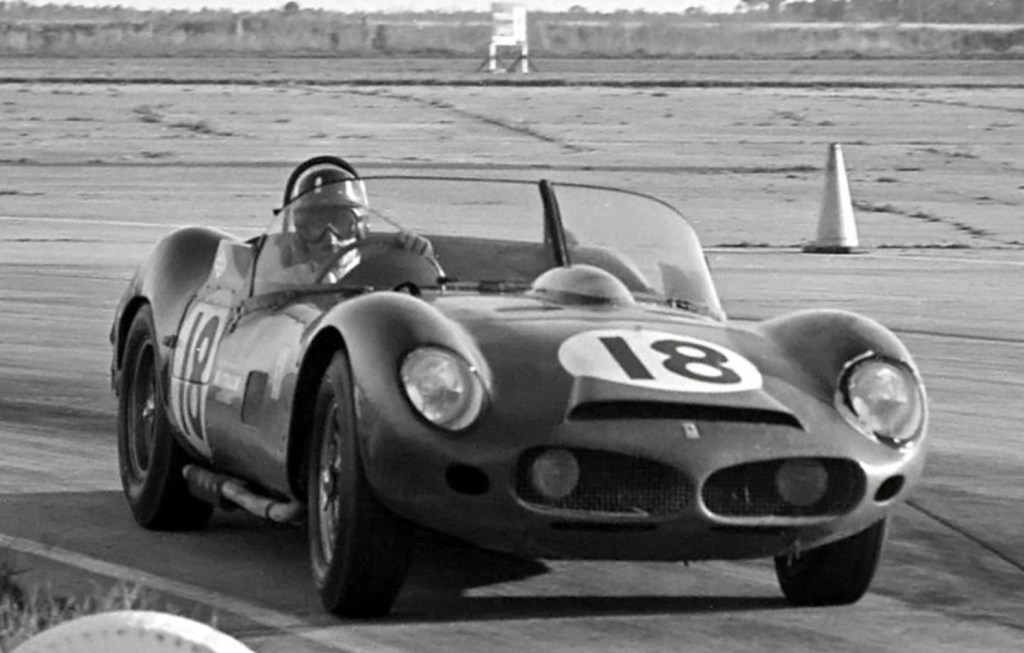 Olivier Gendebien practising the mid-engined Ferrari 268 SP during the Targa weekend in May 1962. The car didn’t start after Phil Hill ran off the road in practice when the throttle jammed open (MotorSport)