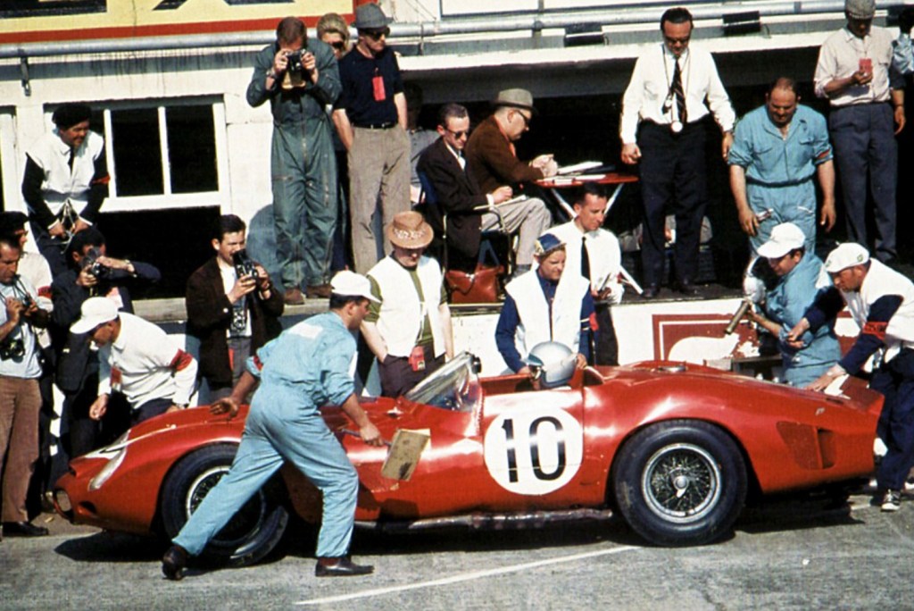 The 330 TRI led the first hour from Graham Hill in the Aston DP212 and three Maserati 151s of Bill Kimberley, Maurice Trintignant and Bruce McLaren. After the first round of pitstops, the Rodriguez’ better handling Dino was soon up to second, while Phil Hill broke Hawthorn’s race lap record in the third hour.