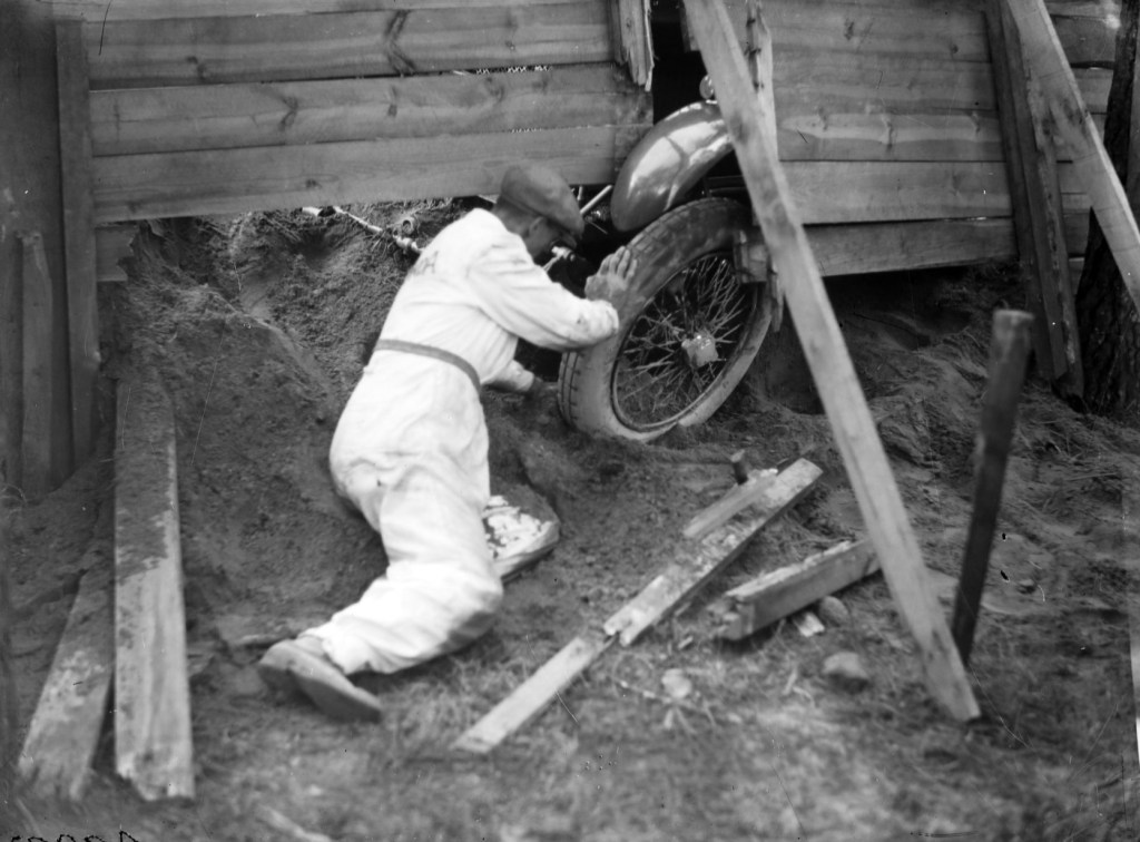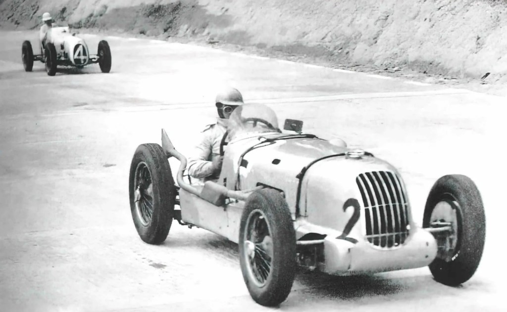 Behind is his brother, Harold ‘Hal’ Cooper’s 2-litre Ballot 2LS #15. In the feature that night, relative novice Alan tried an outside pass on his vastly more experienced younger brother on the last lap, snagged a hub on the fence and cartwheeled along the track at over 100mph and into the sandy area between the track edge and the spectator compound. Alan walked away – shaken and stirred – but the poor riding mechanic wasn’t so lucky, the worst of his injuries was a pair of broken thighs.
