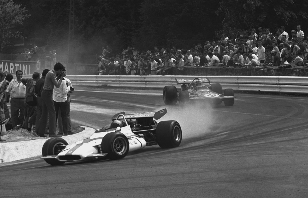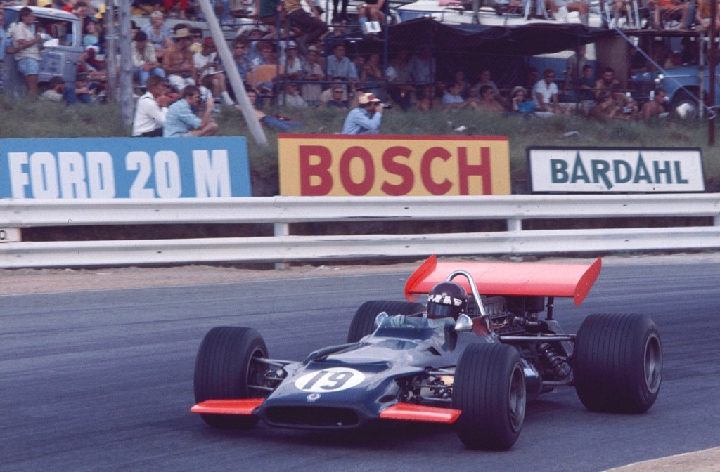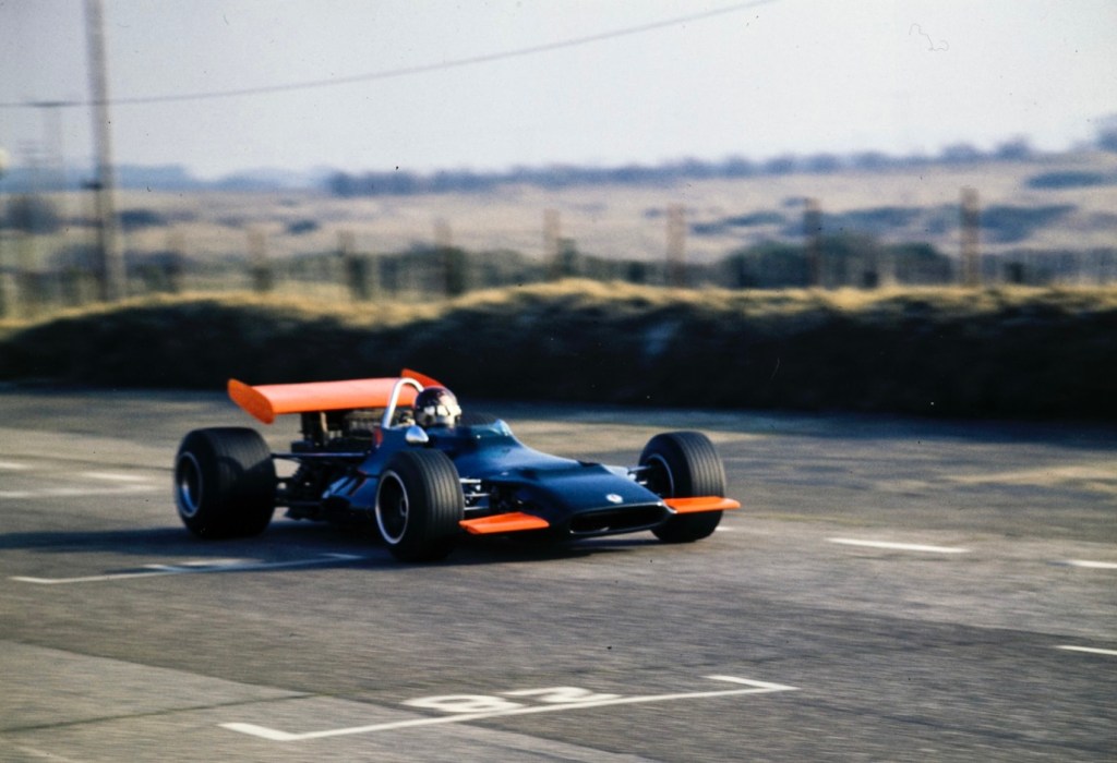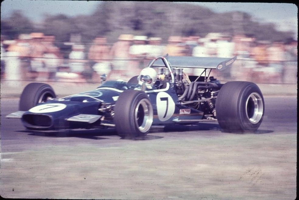Frank Matich contesting the 1970 New Zealand Grand Prix in his much-modified McLaren M10A Chev at Pukekohe. FM had a pretty good Tasman Series, winning here at Pukekohe and at Wigram a week later. While he had the pace, he didn’t have Graeme Lawrence’s Ferrari Dino 246T reliability. Graeme prevailed by five points, 30 to 25.