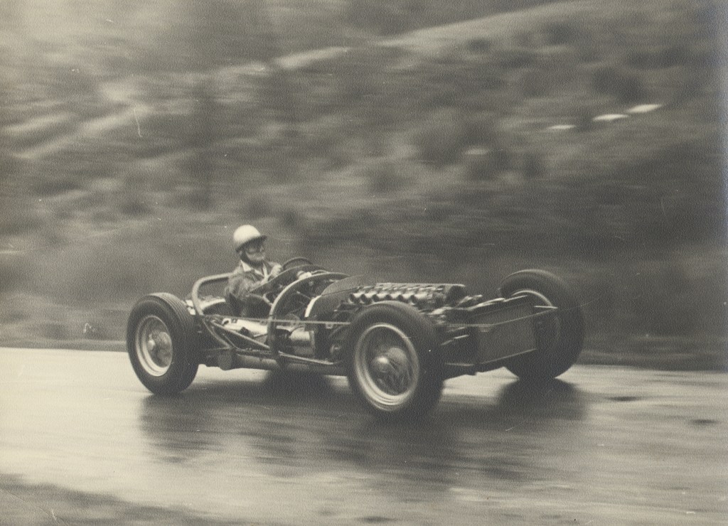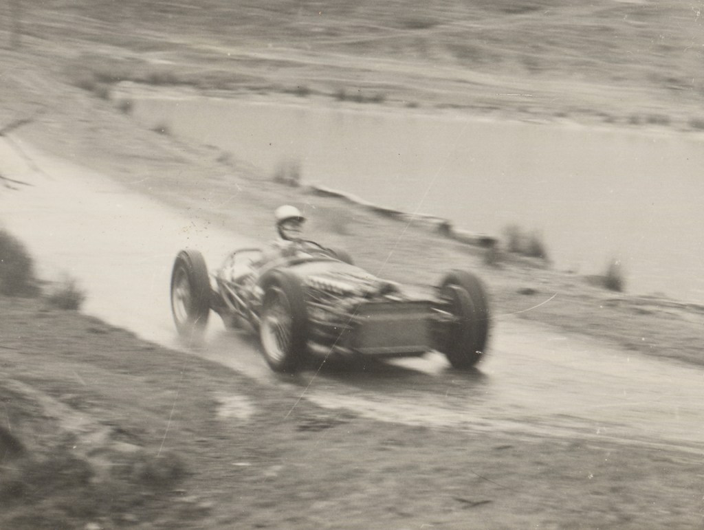 Ross Jensen on the way to victory of the 1959 Bathurst 100 held over the Easter long-weekend, Maserati 250F, #2509/2504. He is negotiating Hell Corner before heading up Mountain Straight.