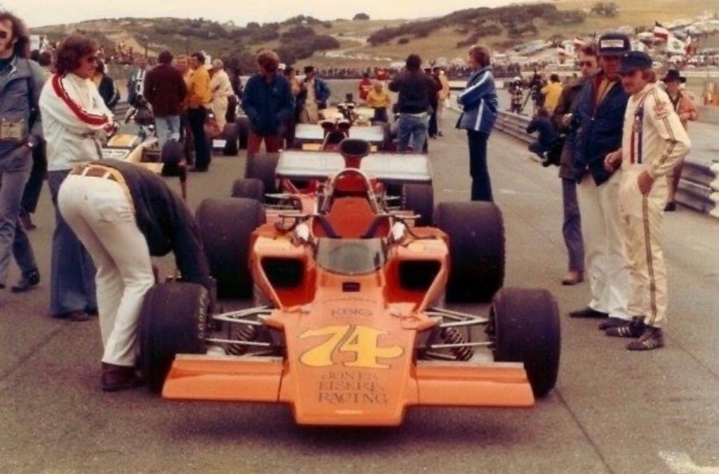 Aussie Ace, Bob Muir alongside the ex-Gary Campbell/Jones-Eisert Lola T330 Chev HU14 during the 1973 US L&M F5000 Championship round at Laguna Seca. Jerry Eisert is alongside Muir, John Wright is attending to the right-front, with Peter Molloy in the white top to the left.