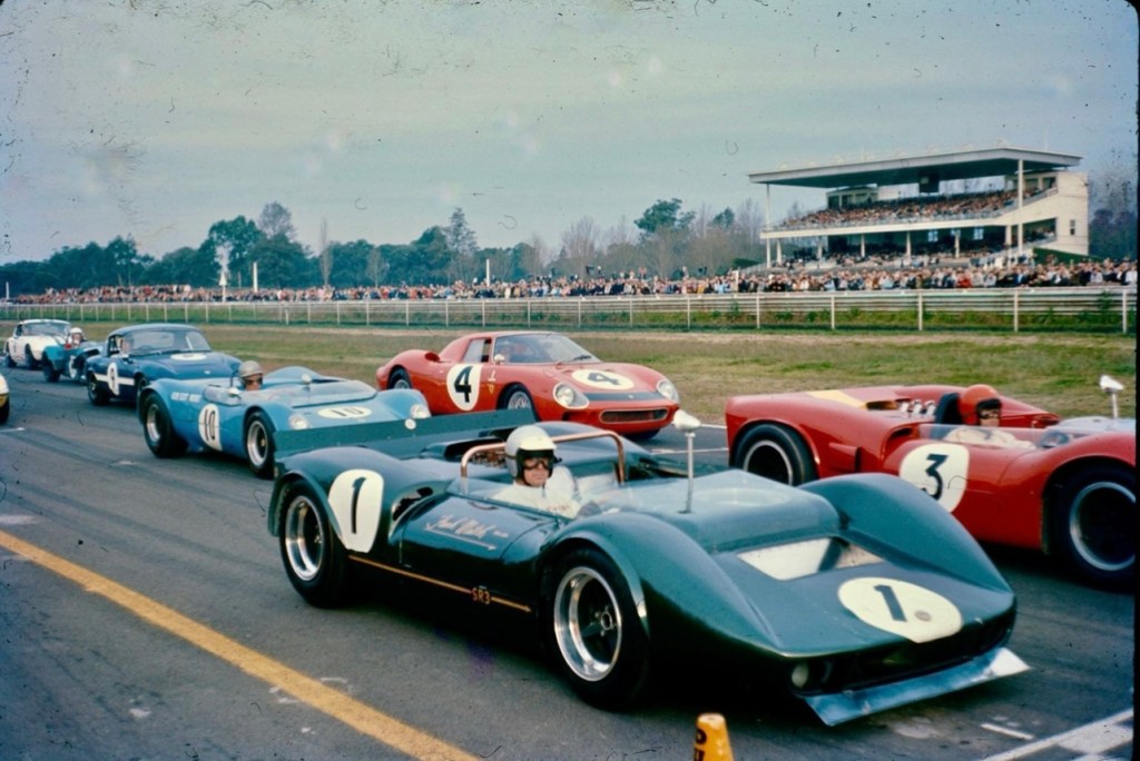 Sportscar grid at Warwick Farm circa 1967. Frank Matich, Matich SR3 Oldsmobile, Bob Jane, Elfin 400 Repco, Glyn Scott’s Lotus 23B Ford and Bill Brown – perhaps – in the Scuderia Veloce Ferrari 250LM. More on Matich’s Ferrari muncher here: https://primotipo.com/2023/04/02/matich-sr3/