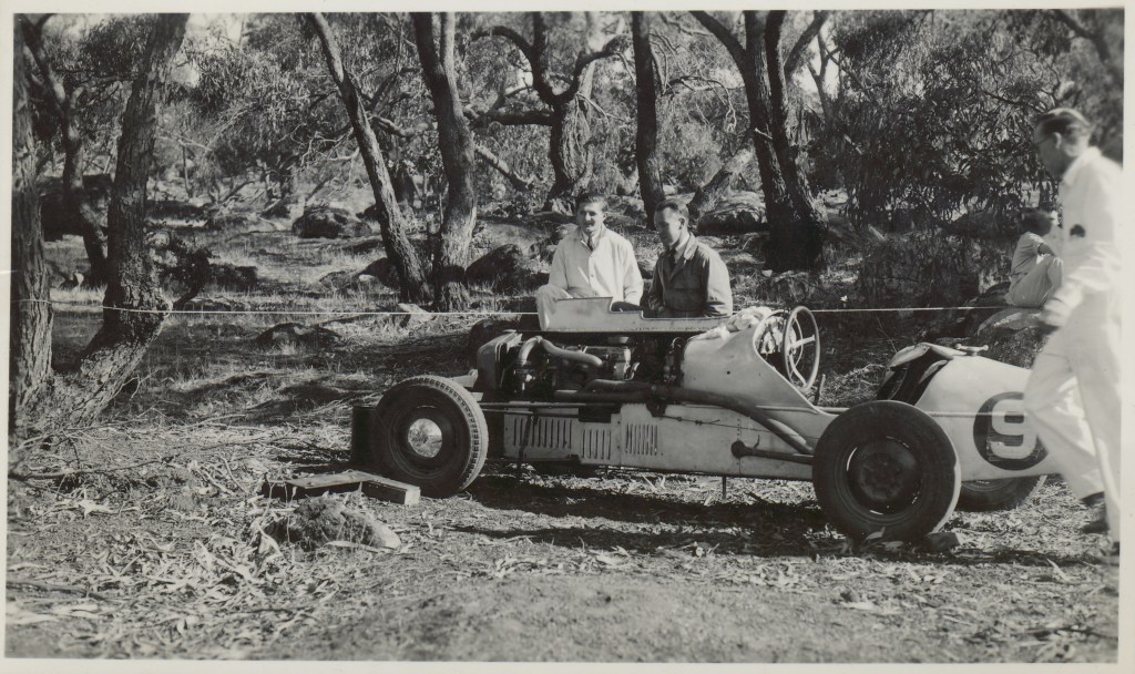 A bit of trivia, “if you enlarge the photo, the open door on the left has CRD (Cyril Dickason) and RCM (Clarrie May) and CRW (Cec Warren) who would have shared the same garage when they raced Austins in the 1931 AGP the year before.”