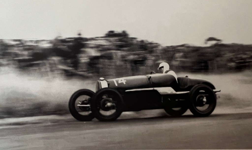 Lyndon Duckett on the way to winning the Longford Trophy in the Anzani Bugatti – Anzani R1 four cylinder, twin-cam engined Bugatti Type 35 chassis #4450 – on March 7, 1955.
