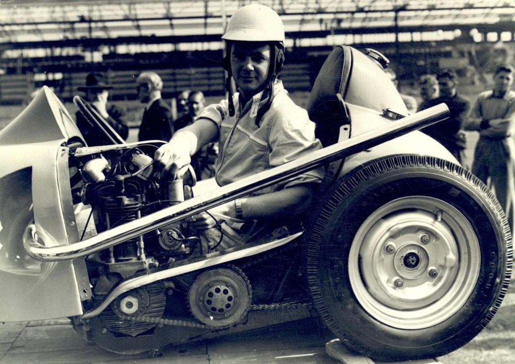 The pair of them went very well, not least in Ronnie’s case because he had been dabbling with cars at home each summer. He and his dad bought a pair of Kieft 500s in 1951, the small engines were soon replaced with supercharged 1000cc Vincent Black Shadow Vee-twins. The cars were very much outright contenders in the Formula Libre. Ronnie recalled in ‘The Ronnie Moore Story’ that “The result was electrifying. I was once clocked at 125mph down Wigram’s main straight – and I was still in third gear.”
