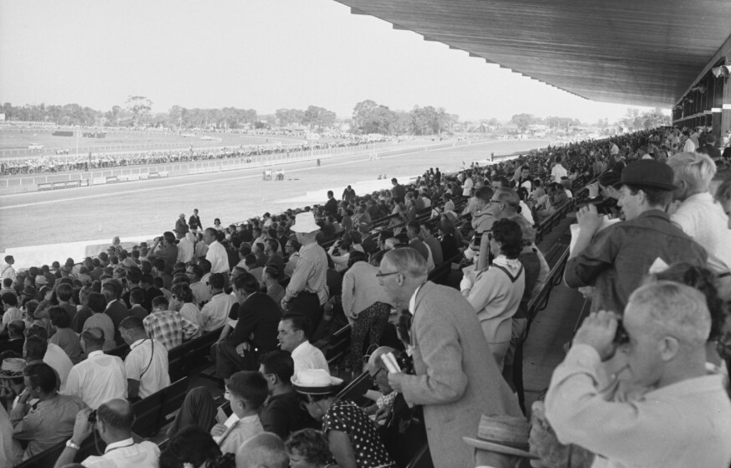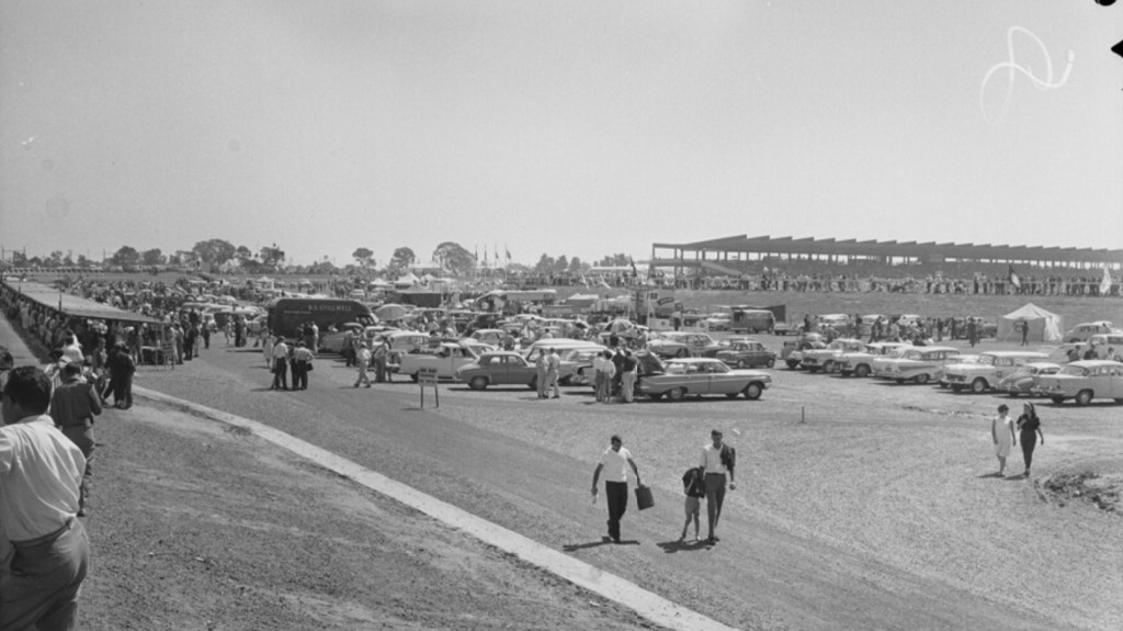 The capacious Sandown paddock above, not quite so accommodating by the early 1970s mind you. Meanwhile old-mate below – craning his neck in the light coloured suit – is upset because he thought he was heading off to his favourite track to see the donkeys galloping around…It was Sandown’s ‘opening car race meeting’ after all, the first clubbie is duly noted.