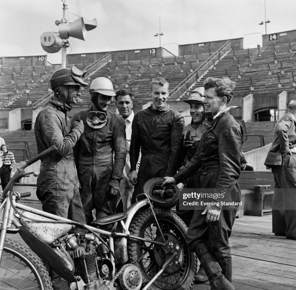 Ronnie Moore, Geoff Mardon, Ove Fundin, George White and Peter Craven prepare to compete in the Speedway World Championship at Wembley in September 1959.