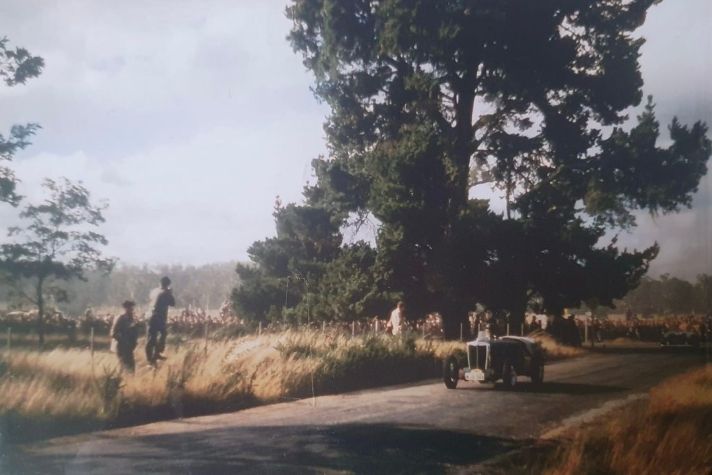 This shot from Tony Johns “was taken during the 1932 AGP weekend at Phillip Island.” #14 is the ninth placed Bill Williamson driven Riley, car #19 Ken McKinney’s Austin 7 DNF. Bill Thompson won the race in a Bugatti T37A.