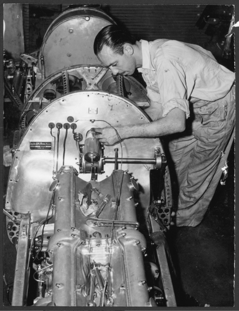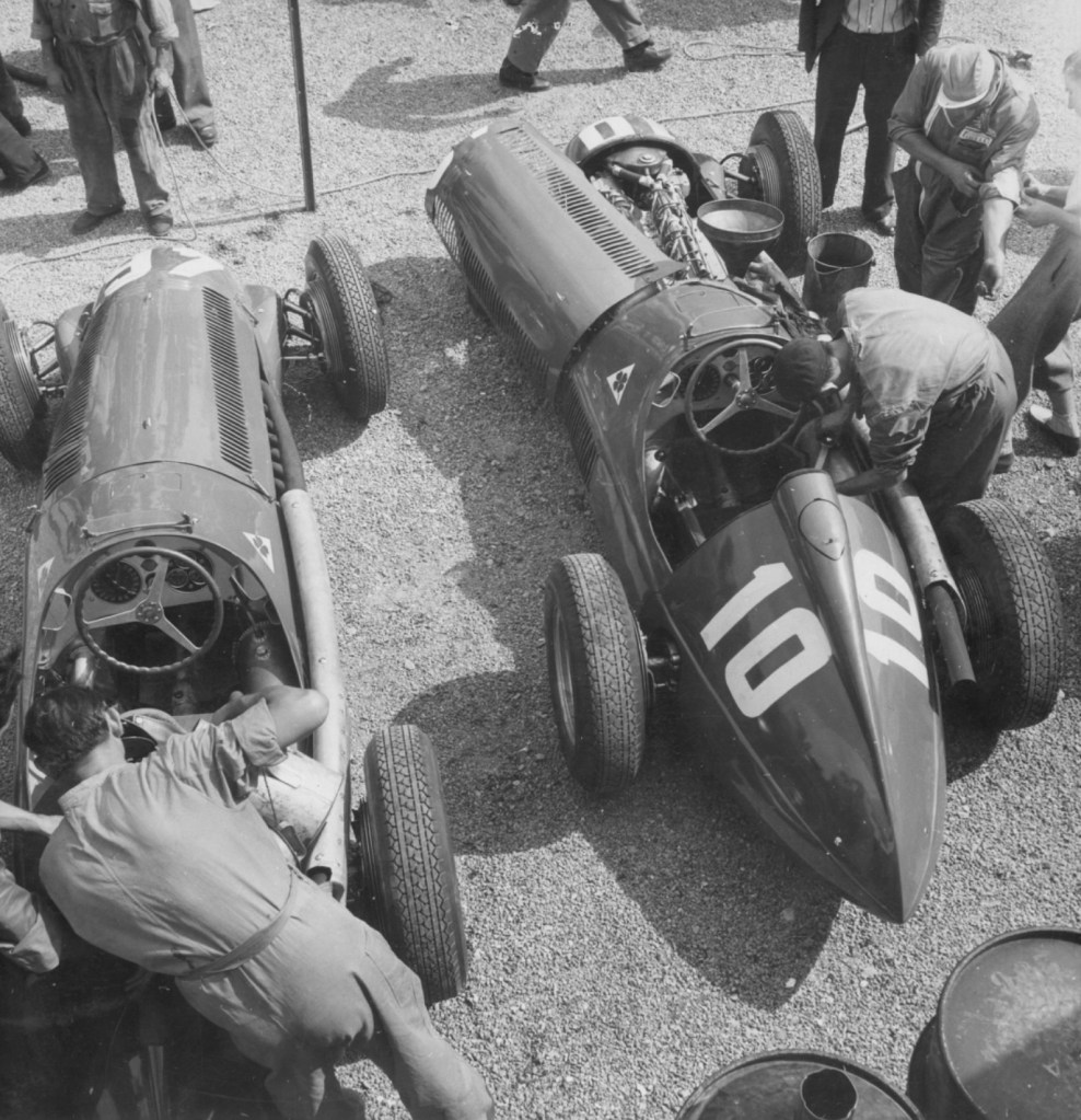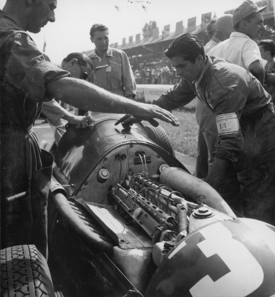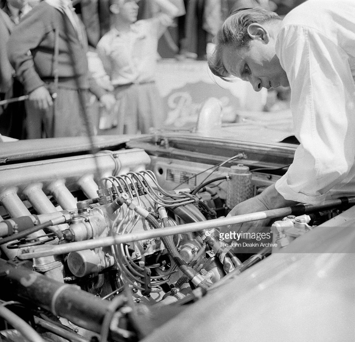 Oscar Galvez fettles the engine of his 3-litre supercharged straight-eight Alfa Romeo 308 in January 1949, can’t quite read the chassis number…