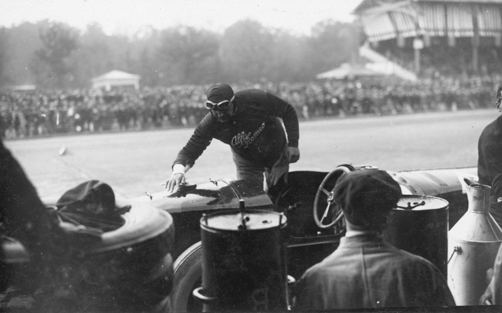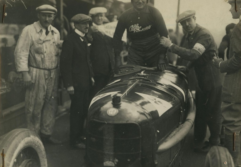 Antonio Ascari in the P2, with designers Luigi Bazzi in the light coloured overalls at left, Vittorio Jano and Giorgio Rimini during the 1924 Italian Grand Prix weekend.