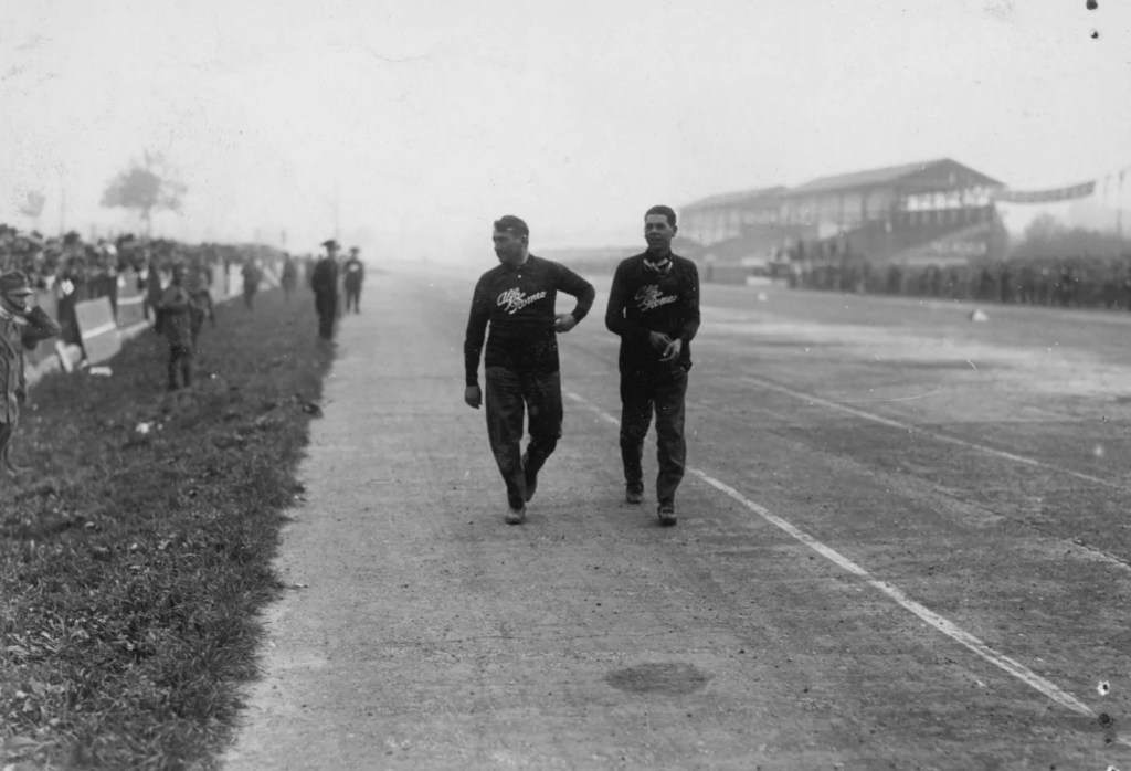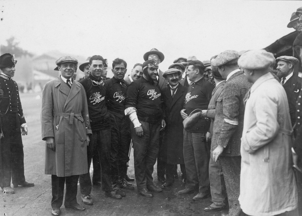 Scuderia Alfa Romeo: unidentified in the overcoat, mechanic Giulio Ramponi, drivers Minoia and Campari, the engineer and entrepreneur Nicola Romeo, and driver Antonio Ascari.