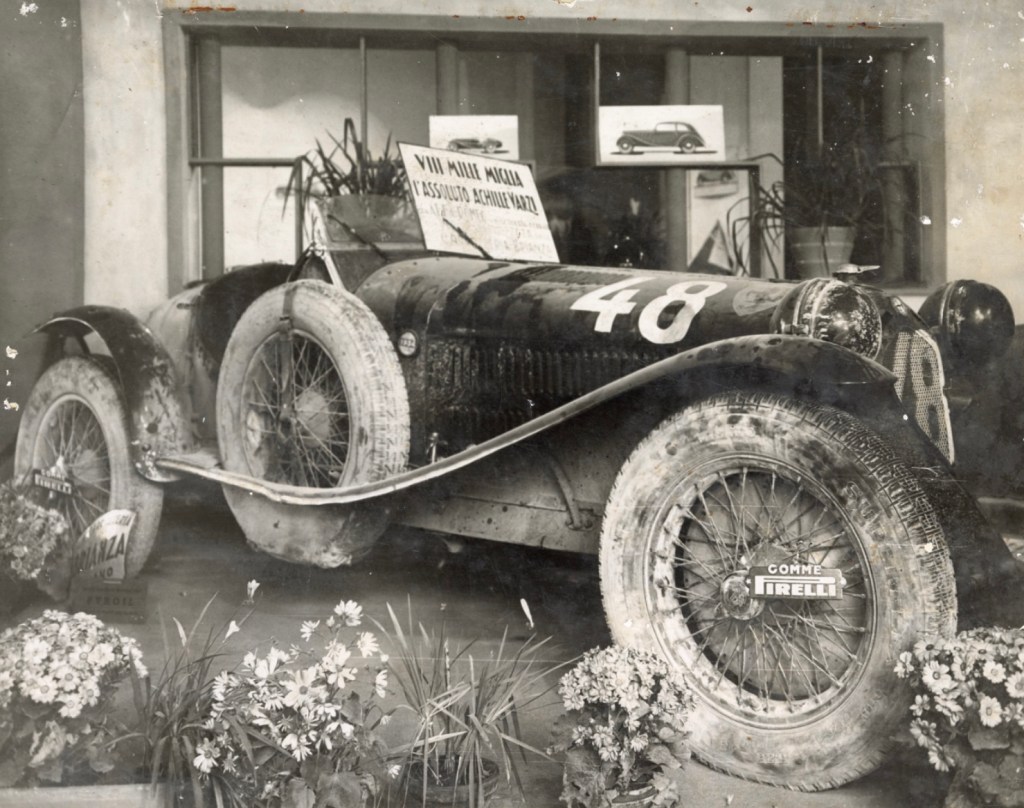Achille Varzi’s Mille Miglia winning Alfa Romeo 8C2600 Monza Spider Brianza on the Carozzeria Brianza Stand in 1934.