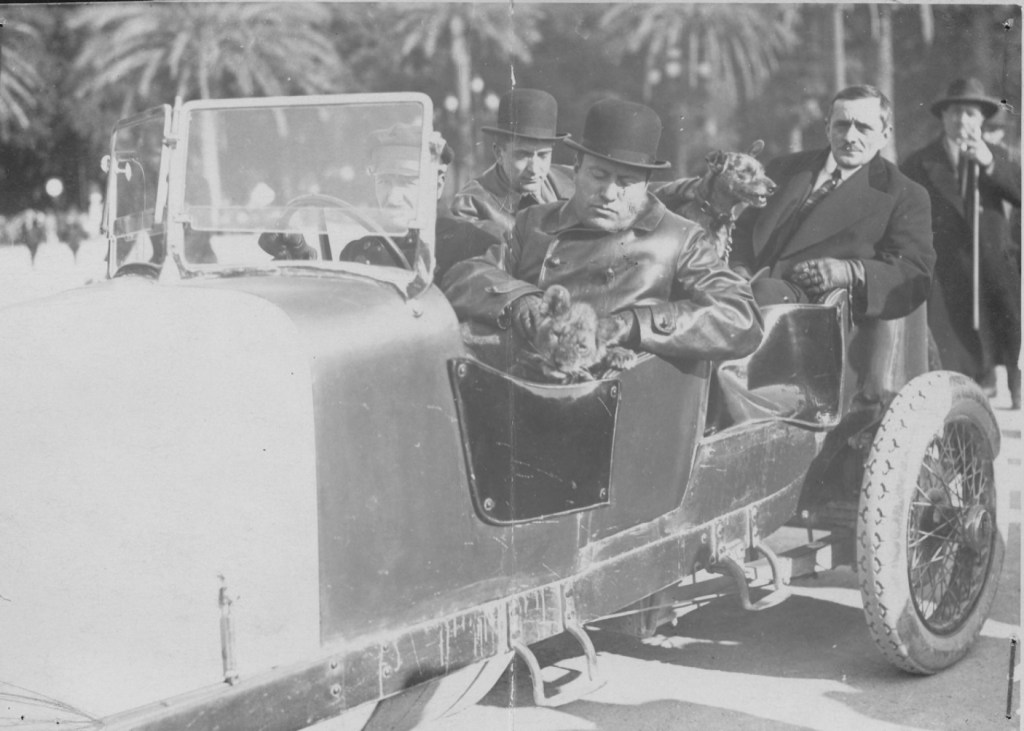 Benito Mussolini and pet pussy aboard an Alfa Romeo in 1923. What model is it I wonder?