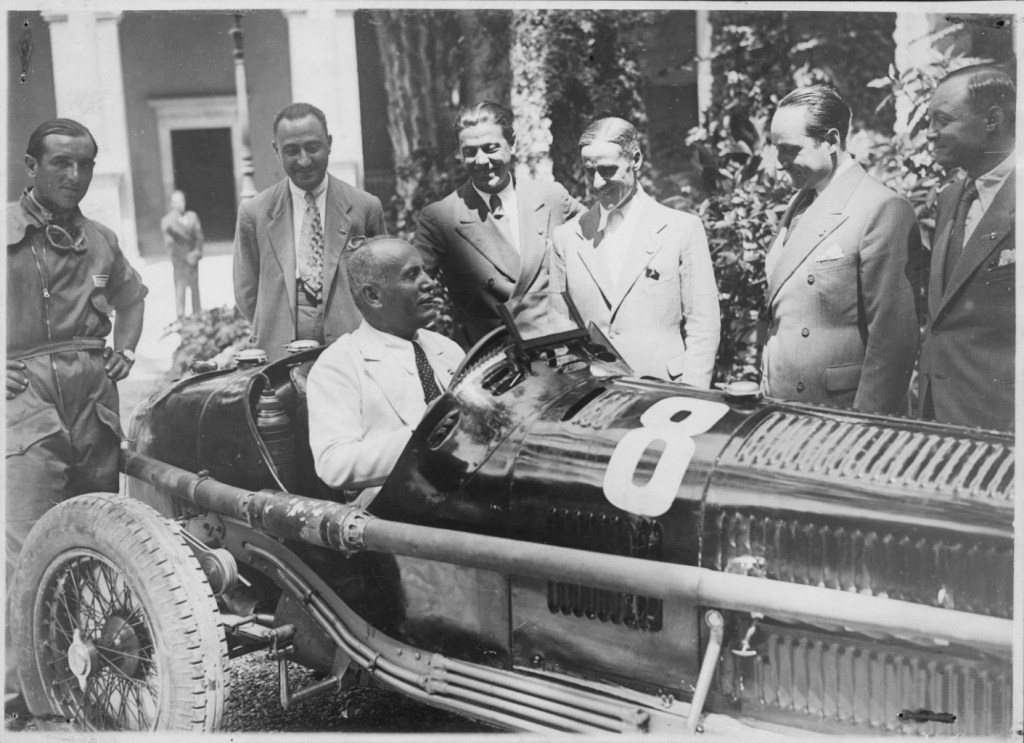 Mussolini with Nuvolari again, and the director-general of Alfa Romeo Prospero Gianferrari (both in the centre). “The P3 is probably the car with which Nuvolari won the August 14, 1932 Coppa Acerbo.”