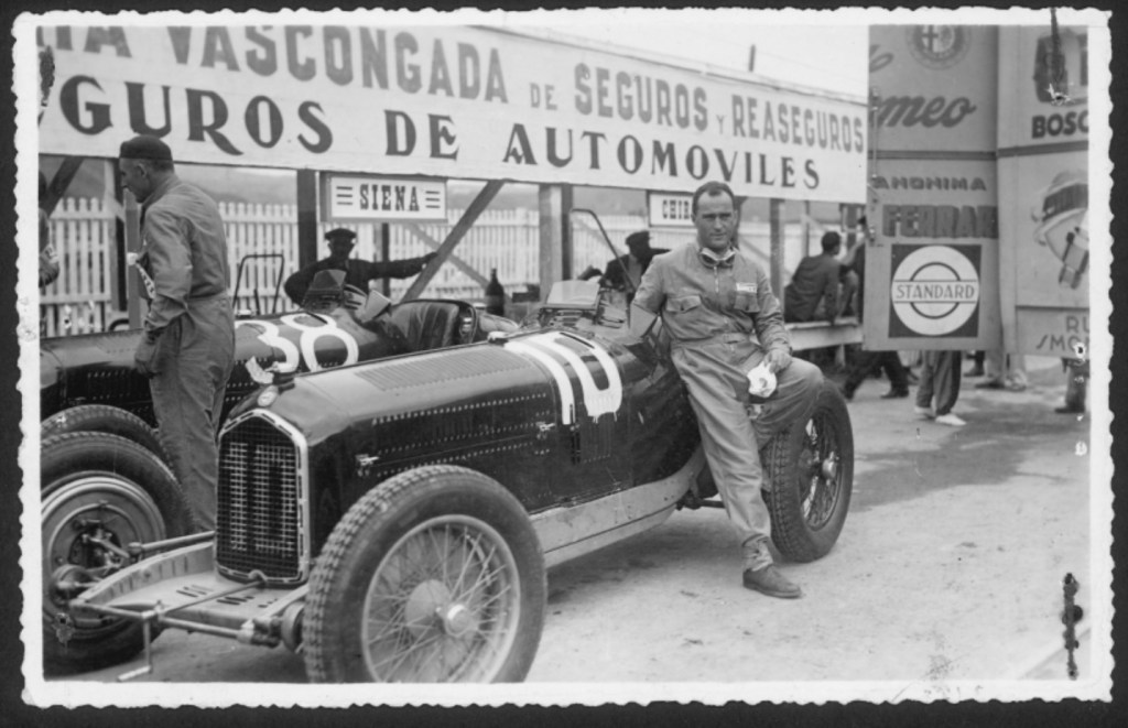 Sticking with the P3 theme, Luigi Fagioli stands beside his car during the September 1933 Spanish Grand Prix weekend. The race was won by Louis Chiron’s Alfa P3 from Fagioli, and held on the Laserte road circuit near San Sebastián.