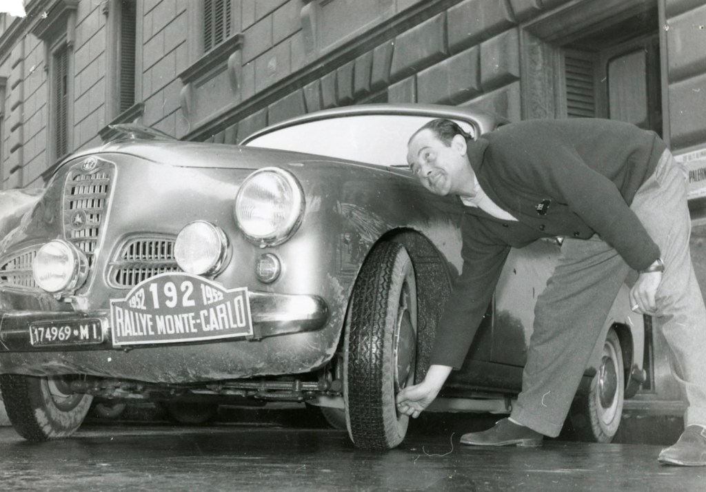 Prince Raimondo Lanza di Trabia inspects his left-front Pirelli, Alfa Romeo 1900 TI during pre-event scrutineering in Milan before the start of the 1952 Monte Carlo Rally.