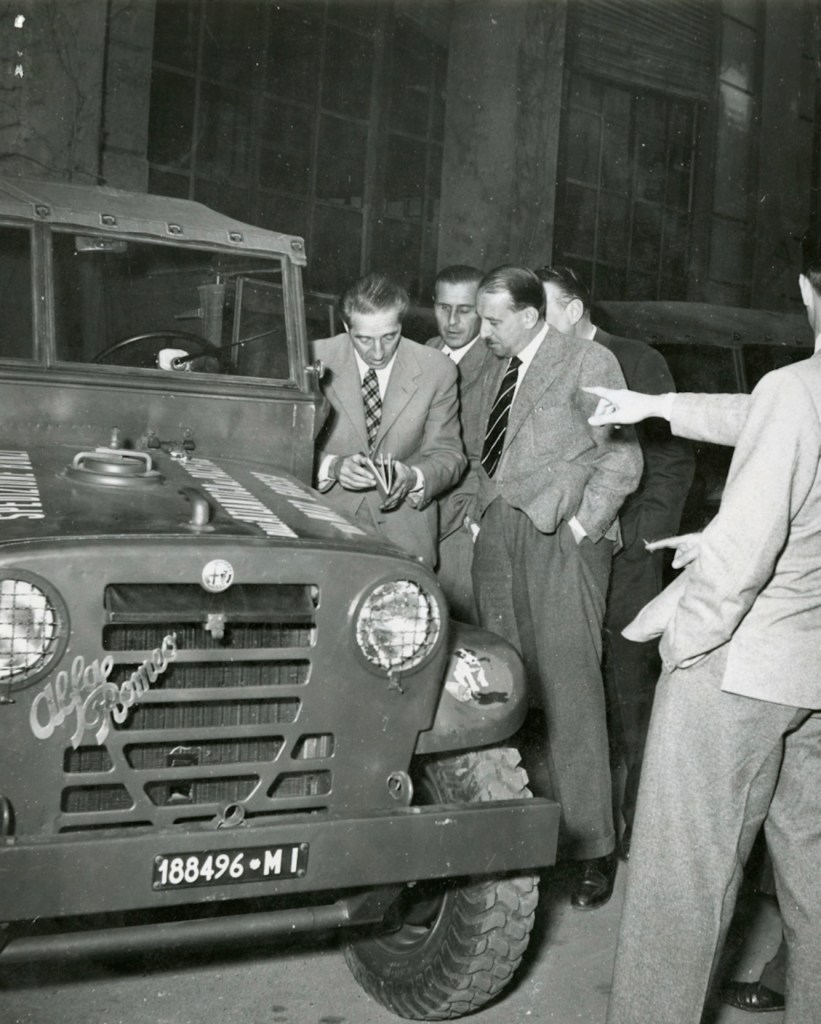 Count Leonardo Bonzi alongside his Alfa Romeo in Bicocca, Milan before the start of the Mato Gross Rally in 1952.