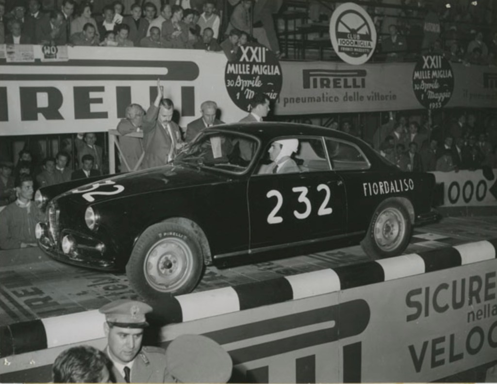 Mille Miglia 1955 start with the Santo Ciocca Alfa Romeo Giulietta Sprint on the ramp DNF. The race was of course won by the Stirling Moss/Denis Jenkinson Mercedes Benz 300SLR.