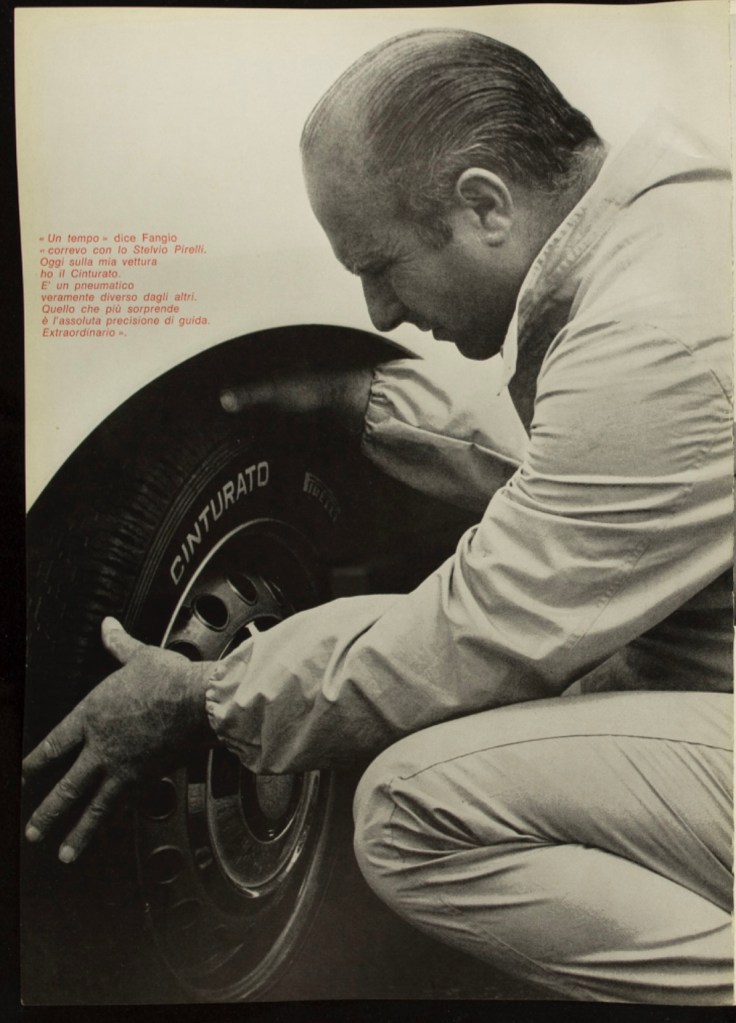 “When he gets out, he looks into the camera and recalls: ‘I used to race with the Stelvio, but now this Cinturato is really different from the rest. Extraordinario!’ And in his magnificent Italian-Argentine manner, Fangio goes on to tell the audience on the television screen about his endless string of successes.”