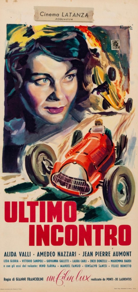 “We are on the Monza racetrack, with the protagonists Amedeo Nazzari, Alida Valli and Jean-Pierre Aumont. It is a sombre tale of betrayal and blackmail in the world of motor sport, in which the driver Fangio plays…the driver Fangio.”