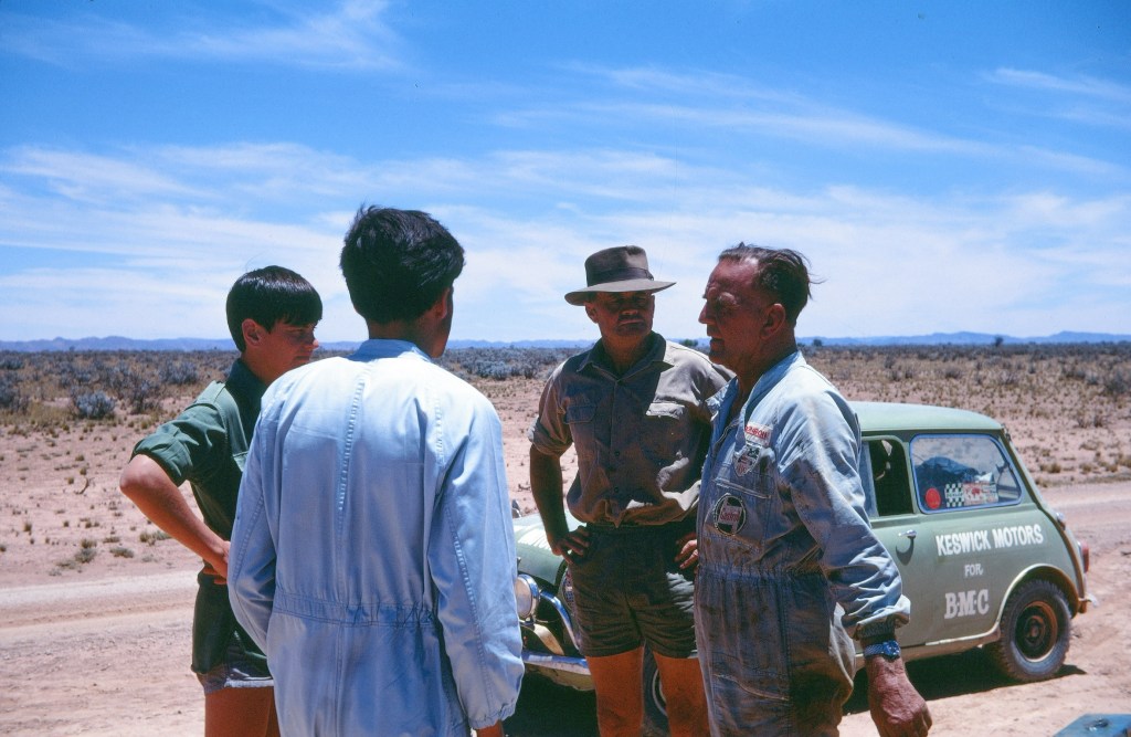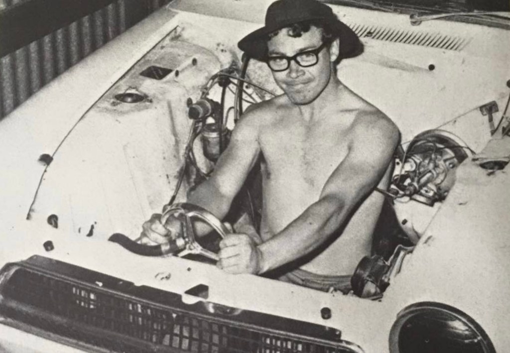 Marvin the Marvel – Allan George Moffat OBE – takes the wheel during a Lotus Cortina engine change somewhere in the USA circa 1966-67.