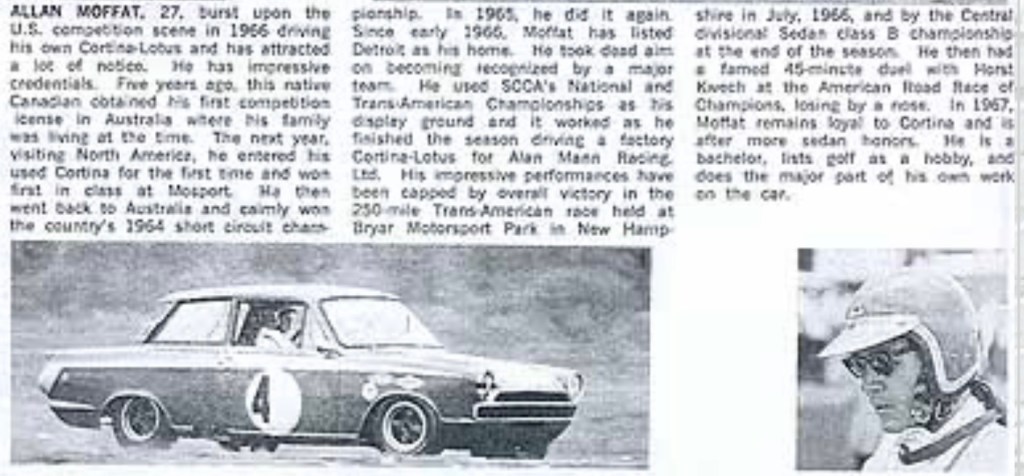 ‘Allan Moffat, 27 (born November 10,1939) burst upon the U.S. competition scene in 1965 driving his own Cortina Lotus and has attracted a lot of notice. He has impressive credentials. Five years ago, this native Canadian obtained his first competition license In Australia where his family was living at the time.’