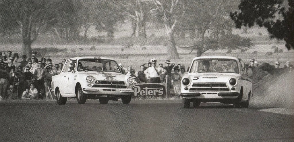 Al-Pal using all the road to stay ahead of Bob Jane on the exit of Mountford corner during the March 1965 Longford Tasman round; Lotus Cortinas both, Moff’s ex-works, Jano’s locally developed.