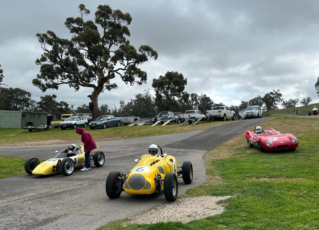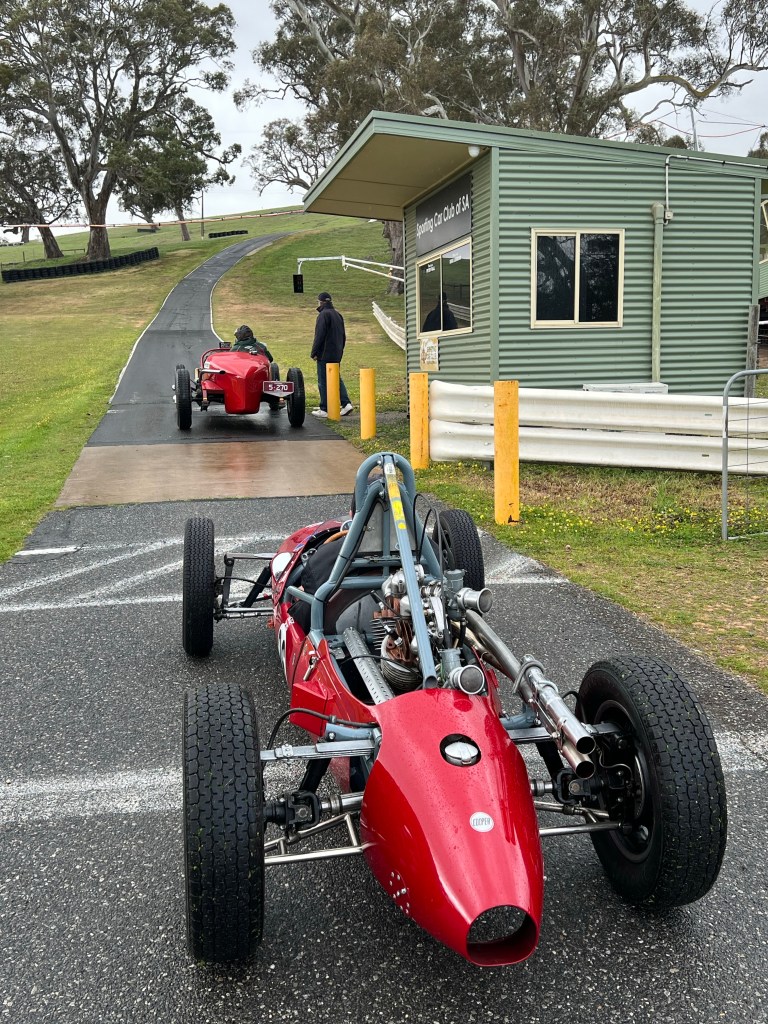 That’s Frank Chessel’s lovely Stag Formula Vee at left and Daniel Jeffries’ Elfin Streamliner at right, both Adelaide built cars.