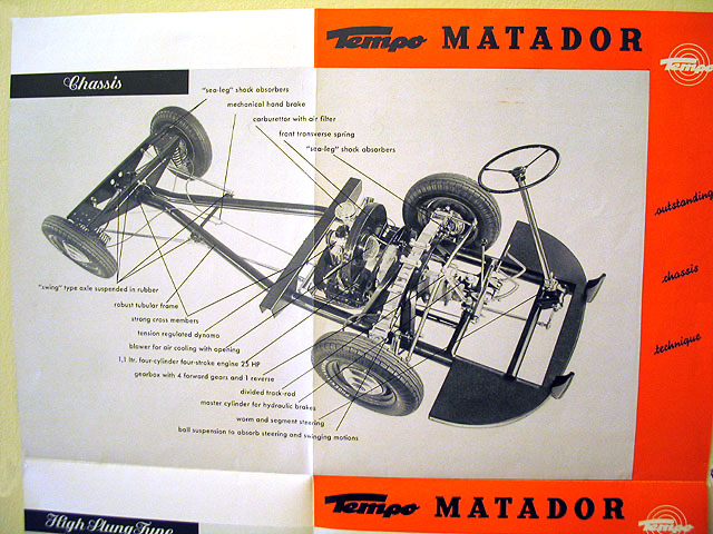 An eight or nine-inch diameter torque-tube connects the motor to a rear mounted clutch and Tempo Matador (VW powered truck) three speed transaxle, while the fabricated independent rear suspension was attached the transaxle with other major components such as the fuel tank, seat and body were bolted to the torque tube.
