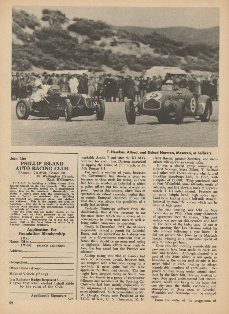 Australian Grand Prix historians will note that at the time of publication – September 1954 – the 1937 Australian Grand Prix hadn’t been invented. That is, the fuckwit(s) who decided that the December 26, 1936 South Australian Centennial Grand Prix should be the 1937 AGP, rather than the 1936 AGP hadn’t done his/their Fake Nooooz thing.