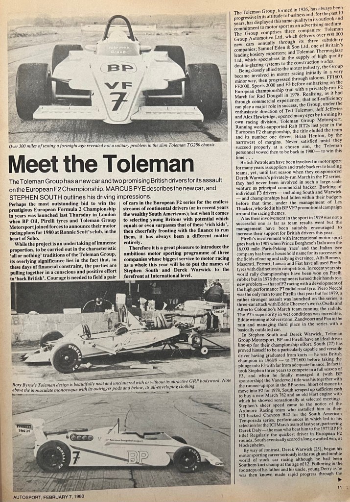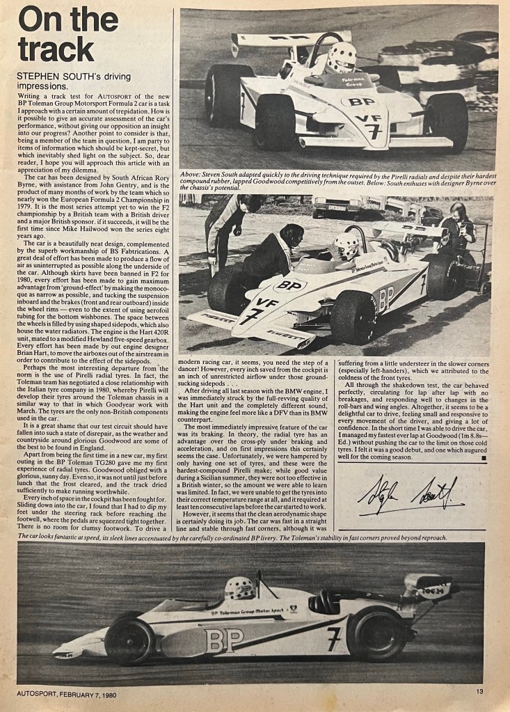The February 27, 1980 issue of Autosport ran this fantastic article by Marcus Pye about the new Toleman TG280 Hart together with Stephen South’s impressions after his first drive of the car at Thruxton.