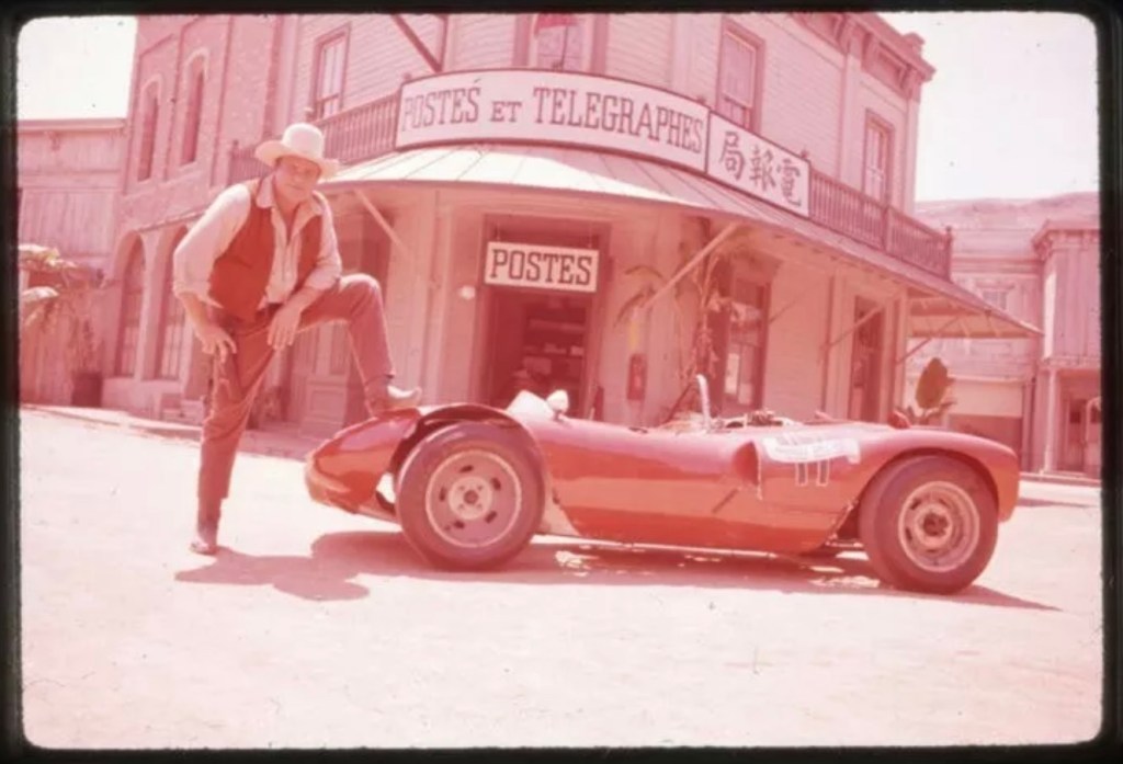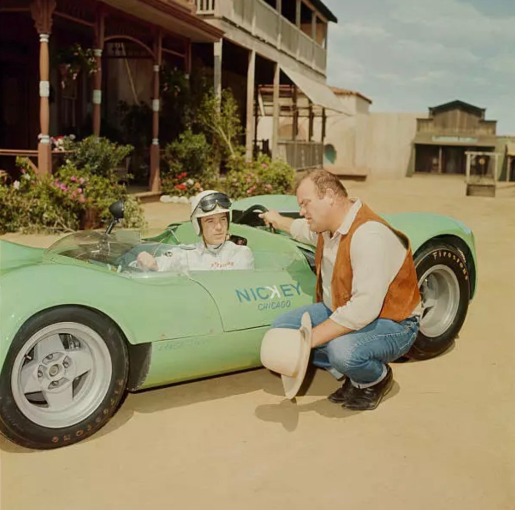 Dan Blocker poses on the set of ‘Bonanza’ with the first racing car he sponsored. The neat, small, fast Campbell Corvette Special was built by ace ex-AJ Watson Indycar fabricator/welder Wayne Ewing for Bill Campbell, an ex-dry-lake racer and boat manufacturer.