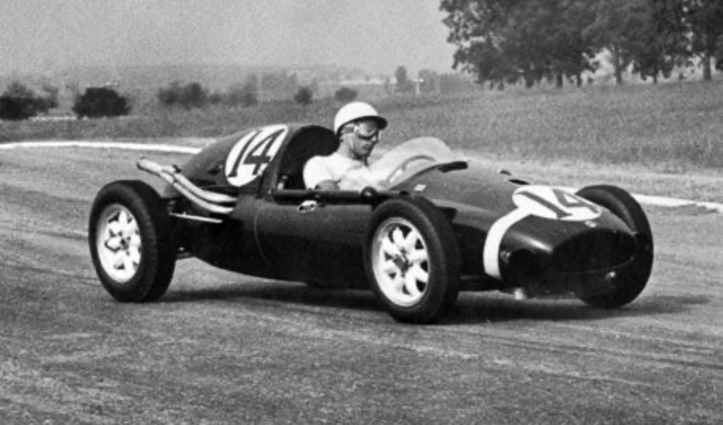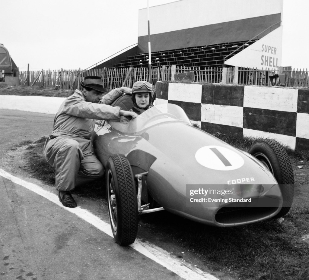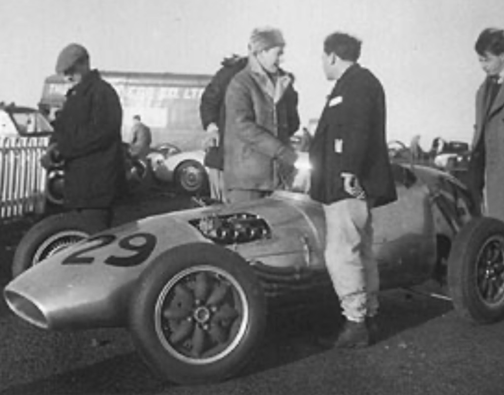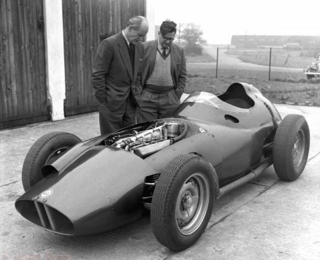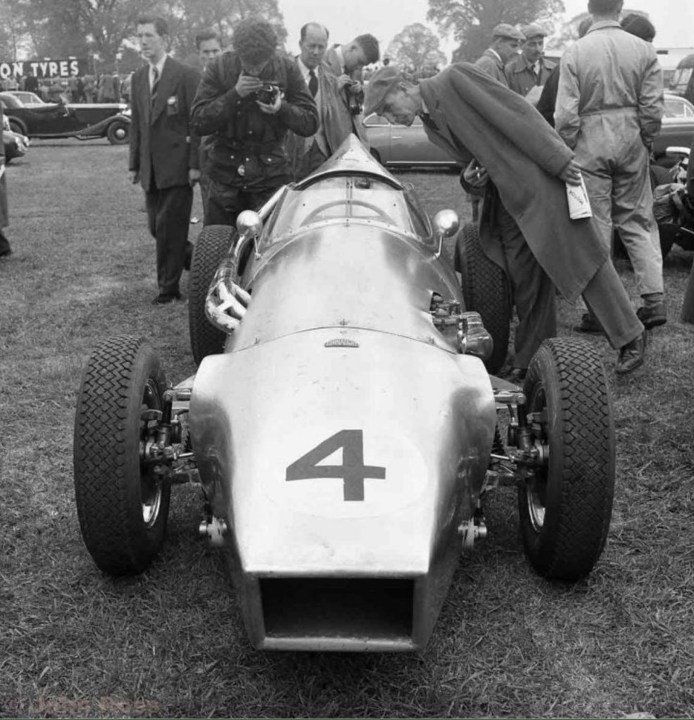 Seeing the possibility of getting into Grand Prix racing by using his Formula 2 racing car John Cooper got together with R. R. C. Walker who was racing Cooper cars and between them they contrived to enlarge the FPF engine as much as possible in order to take advantage of the 2,500-c.c. engine limit. By increasing the bore until the cylinder walls were wafer thick, and making new crankshafts with a longer stroke the capacity was raised to 1,900 c.c. but the operation was in the nature of a bodge, rather than a piece of design, for this increased stroke necessitated fitting a quarter-inch aluminium plate on top of the block forming in effect a very thick gasket, in order to accommodate the increased travel of the pistons. At the bottom end the clearance between the piston and the crankshaft webs was such that any good engine designer would have curled up and died on the spot. The Walker equipe went even further and increased the bore even more until the cylinder walls were way beyond the reasonable safe limits of thinness and got the capacity out to 2,014 c.c. All this ” bodgery” worked up to a point, in a manner that has become the hall-mark of the Cooper firm, the point being that the engine was never able to produce anything like enough horsepower to make it a contender in a serious Grand Prix race, but at least it meant the addition of another manufacturer at a time when Connaught were on their way out.