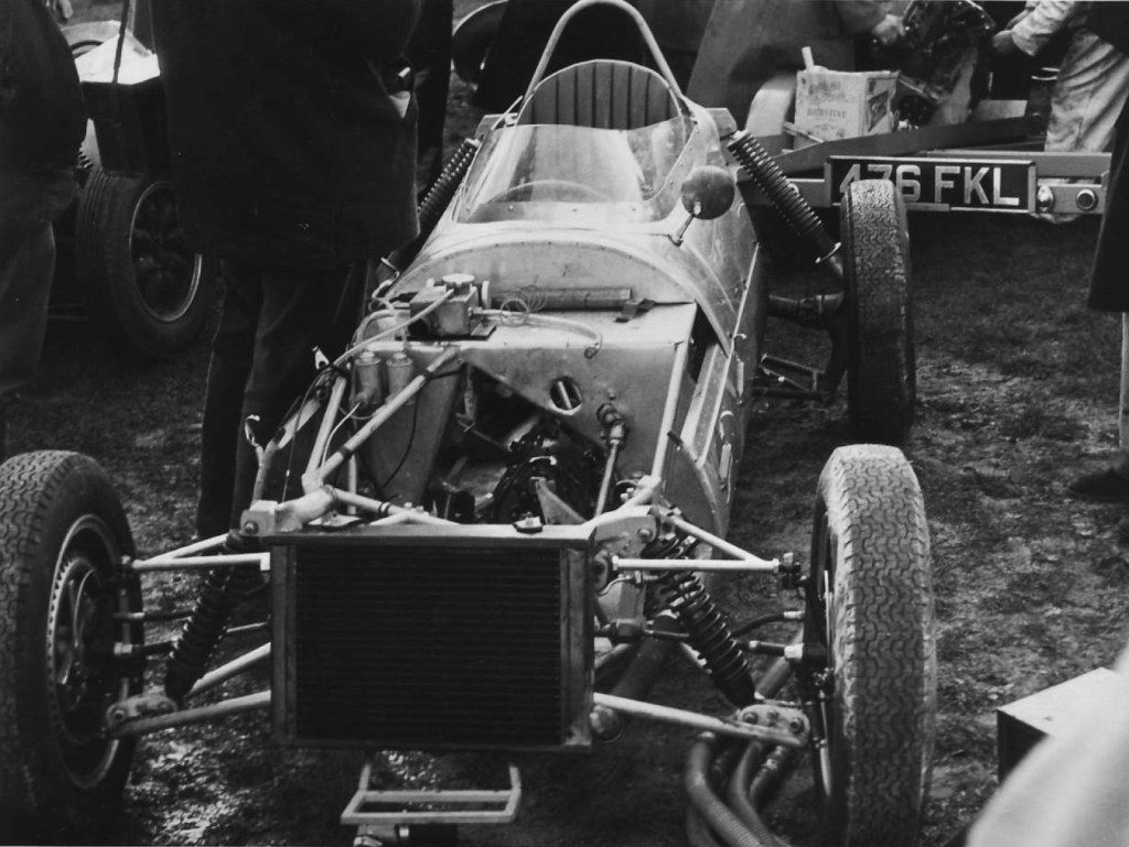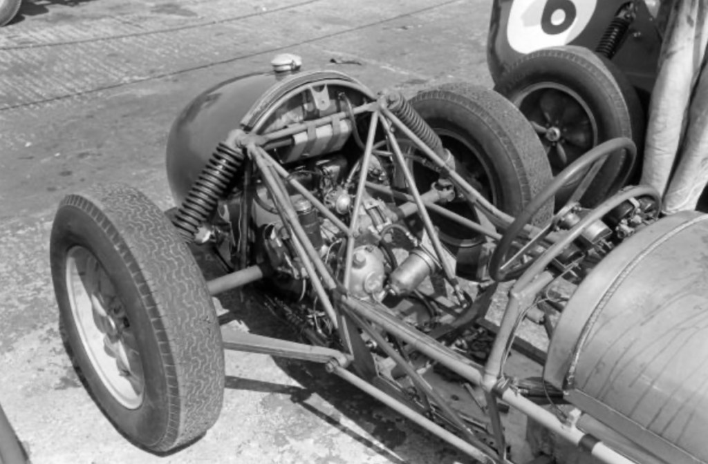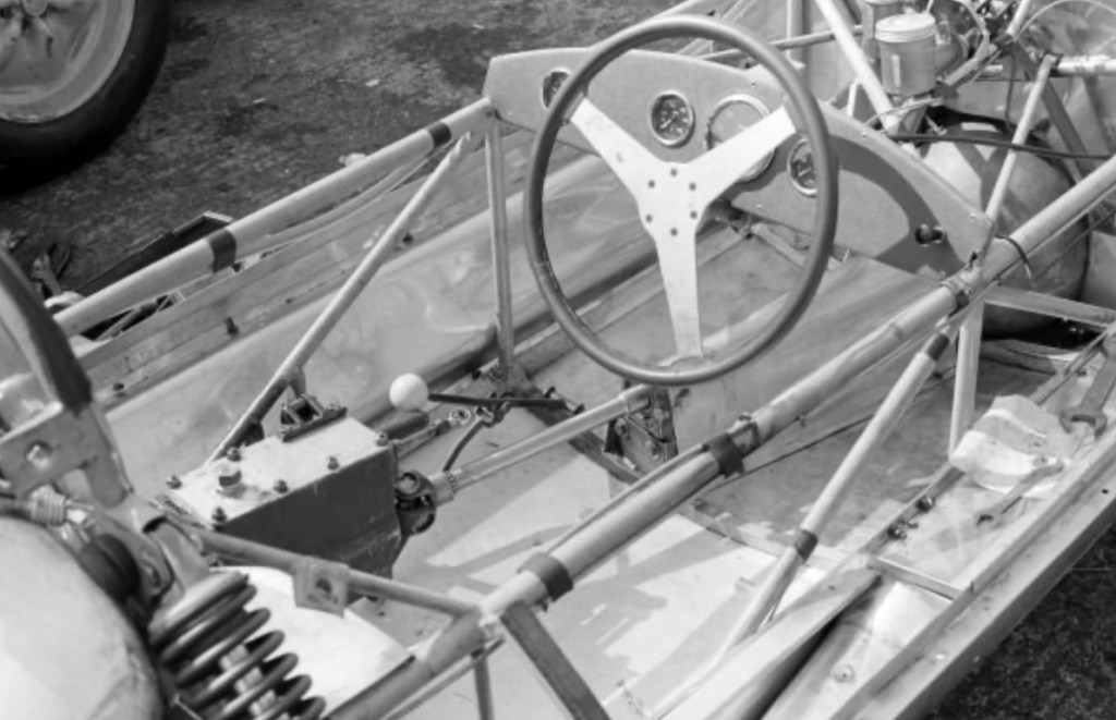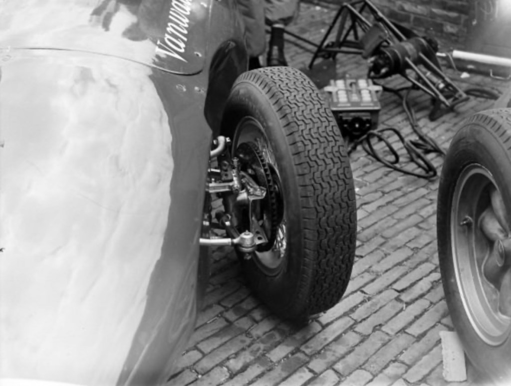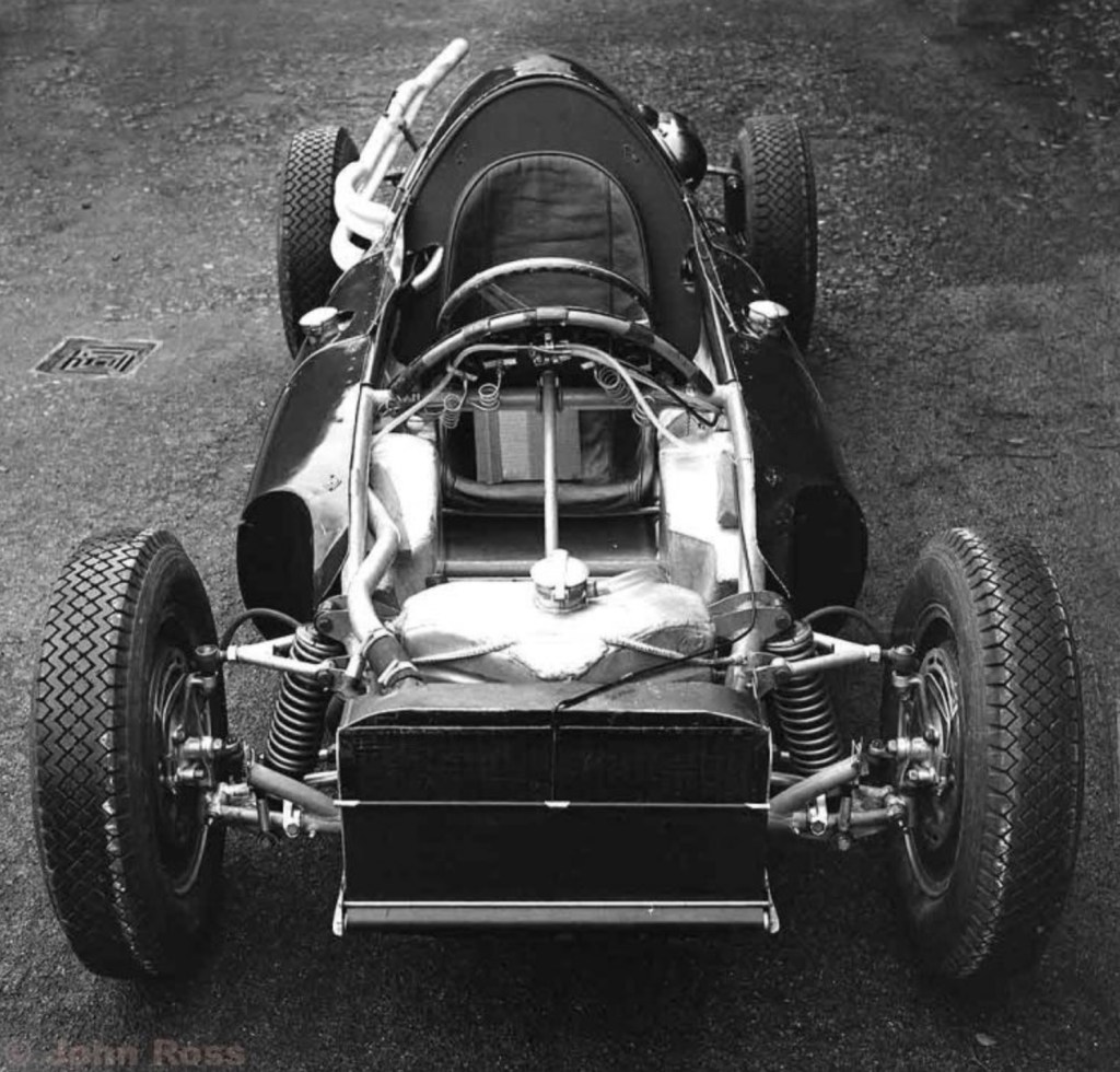 Cooper continues to use his transverse leaf spring and lower wishbone layout, which originates from back in 1945 when he built his first car using Fiat Topolino front suspension. Nowadays the Cooper rear end is a sound and solid affair, with elektron hub carrier, roll-free leaf-spring mounting and good lateral location. On some cars used in Formula l a second wishbone was mounted above the existing one on each side and the transverse leaf spring was coupled to the hub carrier by a free link, thus relieving the spring of braking and accelerating stresses.