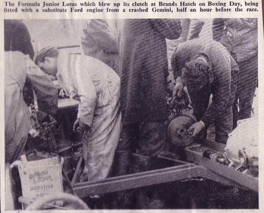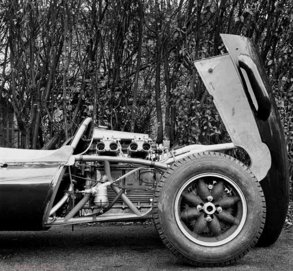 One cannot help feeling that had Lotus been based in Italy they could have got the help of the Weber carburetter firm who would have designed suitable carburetters for the engine layout, probably of the semi-downdraught type as used on the vee-12 Maserati. Throughout the whole period of unsupercharged racing engine design, it has been noteworthy that Alfa-Romeo, Ferrari, Maserati and O.S.C.A. have been able to work in close co-operation with Weber and have special carburetters designed specifically for an individual engine, whereas British engine designers have had to adapt an existing instrument if using Weber. The only co-operation in England has been from the S.U. Company, who designed new double-choke instruments to fit the standard Coventry-Climax FPF unit. Because of his inability to solve the power loss through the altered inlet manifold Chapman had to abandon his horizontal engine position and return to one of near vertical. In passing it is interesting that some years ago when Moto-Guzzi were dominating motor-cycle racing with their 250-c.c., 350-c.c. and 500-c.c. single-cylinder machines with horizontal cylinder layout, Norton Motors experimented with the same idea, turning the renowned Manx Norton engine through 90 degrees, but the idea was abandoned because they could never overcome the carburation problems.