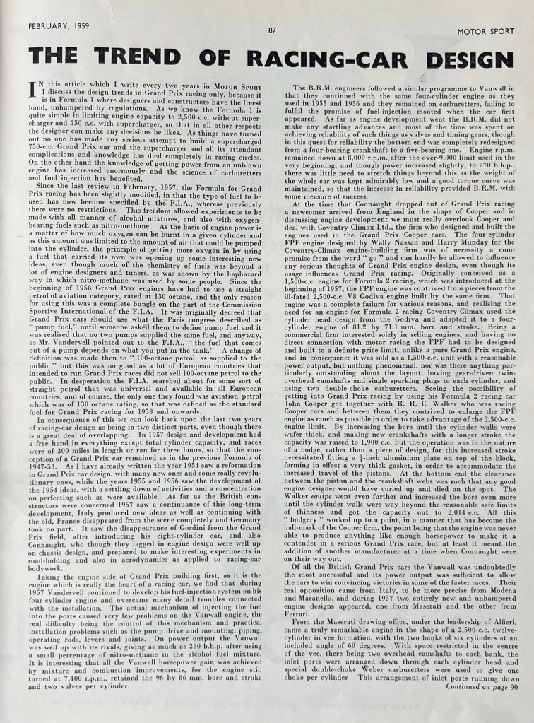 Cooper and Lotus, on the other hand, started in Grand Prix racing with a car designed for an entirely different type of event, and by good fortune the change in the Formula tended to sway in their direction so that only a very slight increase in size in 1958 made their cars much more suitable for the racing encouraged by the present Formula, which is in the nature of non-stop sprint-like events.