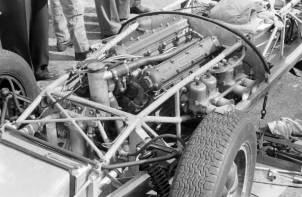 With the 130-octane ruling in 1958 one might have expected engine design to change, but such short notice was given of the fuel regulation that Vanwall, B.R.M. and Maserati could do little except adapt their existing engines. Cooper had to rely on whatever engine development work was being done by Coventry-Climax, and they were joined by Lotus in the Formula 1 field, who also relied on the Coventry firm for their power unit. Ferrari was the only one who was able to take advantage of the new fuel regulation and had no trouble as his engine had never used anything else but straight petrol. As Maserati had given up racing officially they did not bother too much about converting their trusty 250F six-cylinder to run on aviation petrol, and for the first race they merely recommended a change of jets to their customers, not even bothering to lower the compression ratio. The surprising thing was that the Maserati engine responded to this treatment and went on working throughout the season with no drastic alterations, though later the factory built some new engines with modified cylinder heads. This fact rather indicated that in 1957 they were either not taking full advantage of the alcohol/nitro-methane mixture they were using, the engine was running too cool, or that 130-aviation spirit was able to produce as much power as alcohol. This latter suggestion, coupled with different working temperatures, seemed to be the keynote of Grand Prix engines in 1958 for Vanwall found their power output still around the 270 b.h.p. mark, as did B.R.M., but working temperatures had gone up by as much as 200 degrees at the exhaust valves so that getting the Vanwall and the B.R.M. engines to run on straight petrol was not so much a problem of thermo-dynamics and combustion as one of metallurgy. Coventry-Climax made little advance in 1958 the unit being used in Formula 1 still being the mechanical “bodge” that had been perpetrated in 1957, though it did prove surprisingly successful as a result of unreliability in the more advanced designs. With Lotus taking part in Grand Prix racing it was not surprising that some new ideas were forthcoming and Chapman designed an intriguing new car with the engine canted over to lie almost horizontal. This meant a few modifications being made to the FPF unit in respect of oil collection, but it is interesting that drainage of the valve gear was no problem for the cylinder head had been originally designed to run in a canted-over position on the Godiva V8. The main problem involved was that of carburation, for they had to use an existing Weber horizontal double-choke instrument for each pair of cylinders, and within the space limitations under the bonnet the only possible shape of inlet manifold caused a considerable power loss, which they could ill-afford.