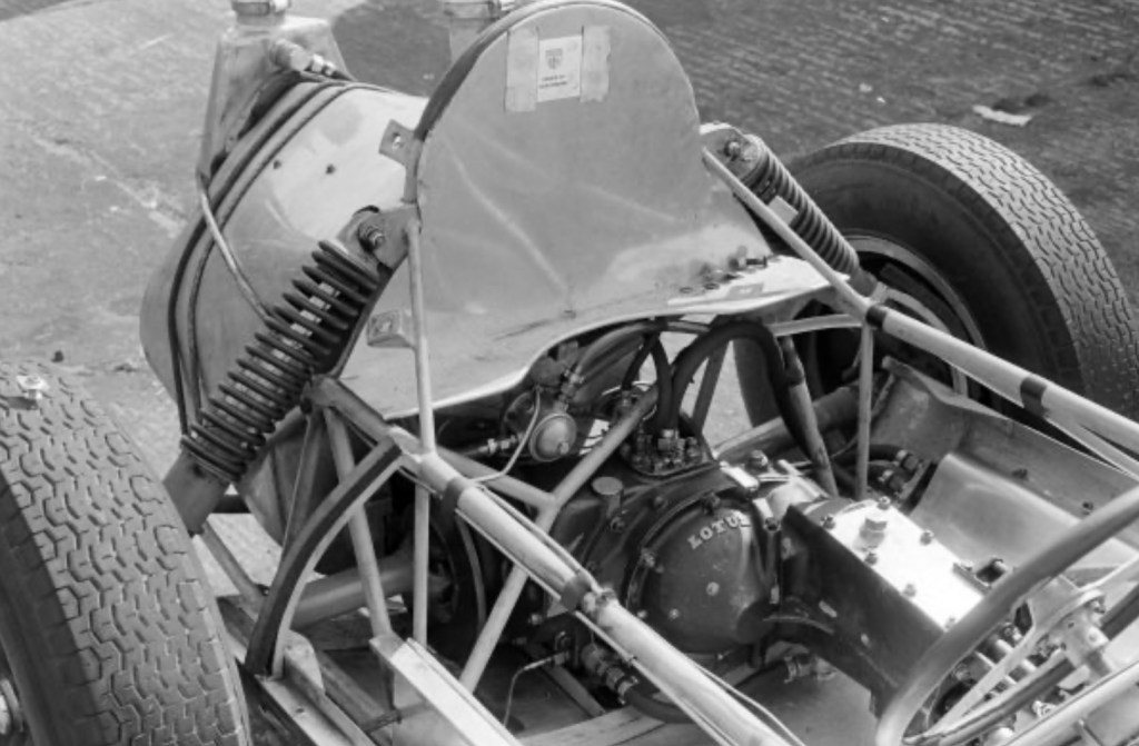 On rear suspension Chapman and Cooper diverge widely, though both are fully independent, the former having an ingenious layout in which the hub is positioned in three directions, one forwards and inwards by a radius arm, one completely inwards by the half-shaft which has two universal joints but no sliding spline, and the third by the coil-spring unit which provides upwards and inwards location. With the radius arm, the half-shaft and coil spring forming an equilateral triangle with the whe l hub at the apex, this suspension is a new approach and in consequence called for a new name, and was called the “Chapman Strut Principle.”