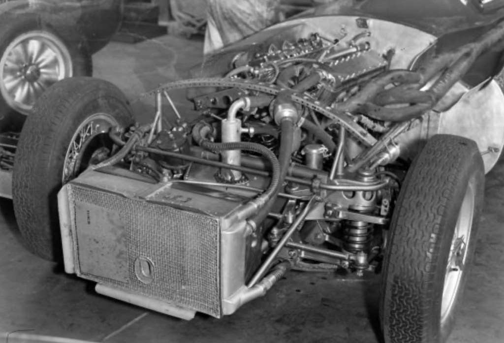 From the Maserati drawing office, under the leadership of Alfieri, came a truly remarkable engine in the shape of a 2,500-c.c. twelve-cylinder in vee formation, with the two banks of six cylinders at an included angle of 60 degrees. With space restricted in the centre of the vee, there being two overhead camshafts to each bank, the inlet ports were arranged down through each cylinder head and special double-choke Weber carburetters were used to give one choke per cylinder. This arrangement of inlet ports running down past the plugs was unusual but not new, having been used by Mercedes-Benz on the W196 engine, and by B.M.W. before that. The Maserati engine used a bore and stroke of 68.5 by 56 mm., and this very short stroke allowed for high r.p.m. with 10,000 often being used. With such high speeds in use ignition was a problem, the orthodox magneto being unable to withstand the speeds and deliver sufficient sparks to the 24 plugs, there being two to each cylinder. A high voltage coil and distributor system was used, with a 12 contact distributor driven off each inlet camshaft and 24 separate coils mounted on the scuttle, current being supplied by a battery carried in the cockpit. Revs and power were no problem to this new engine, nor was the reliability factor lacking, but as B.R.M. had found back in 1950-53 such high revolutions with a limited power range proved very difficult for the driver to control. Although Maserati used a five-speed gearbox the car was always suffering from the r.p.m. dropping below 6,000 at which there was little torque. Without the use of extra special fuels this engine developed over 300 b.h.p. and had it been used with a six- or eight-speed gearbox it might have proved successful. However, after a whole season of development, during which time it proved remarkably reliable, but not very practical, the project was shelved due to Maserati giving up factory racing participation.