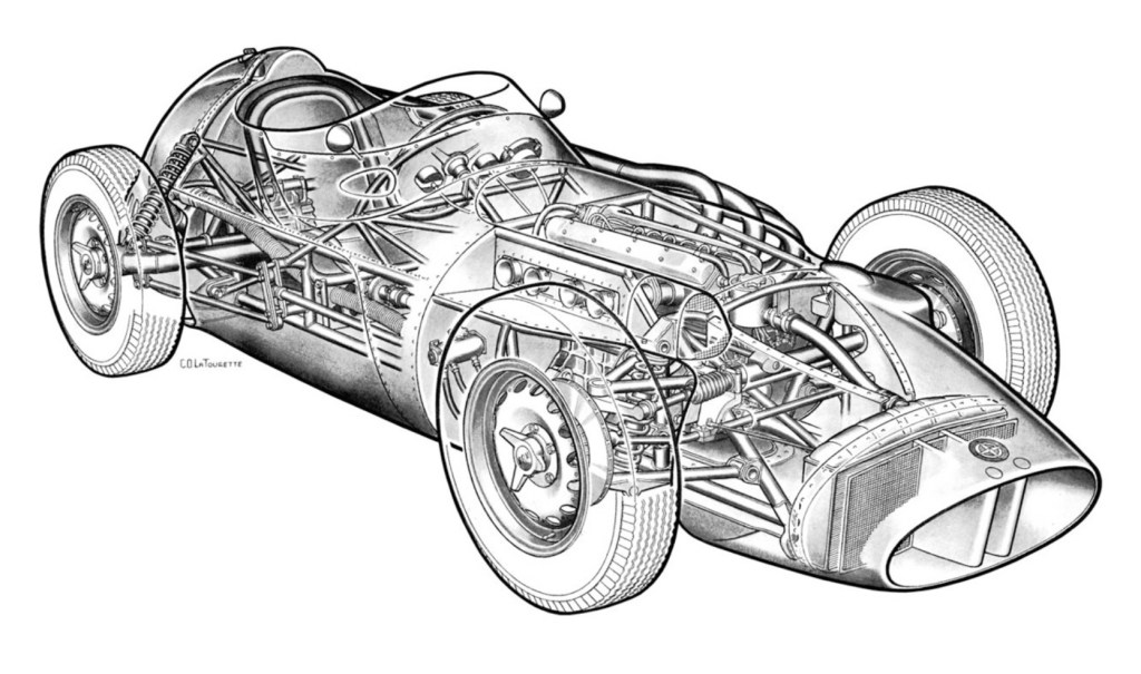In the realm of chassis and suspension design it has again been Colin Chapman who has provided the new ideas, on his own Lotus cars, and in consultation with B.R.M. and Vanwall. One thing that is significant is that space-frames are now universal, except that Ferrari went from a full space-frame on his Formula 2 car to a semi-space-frame on his Dino Formula 1car.