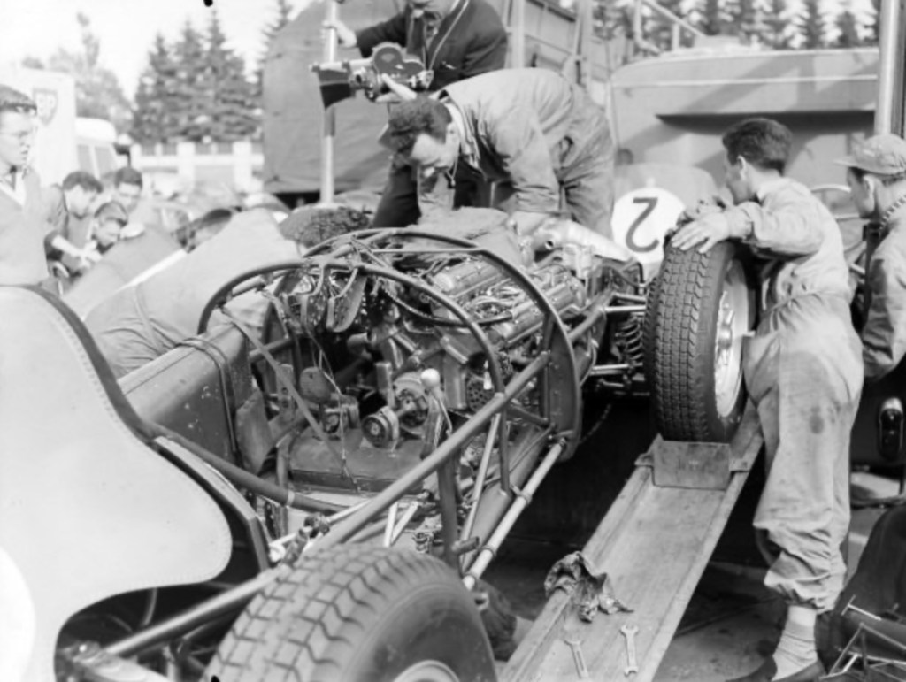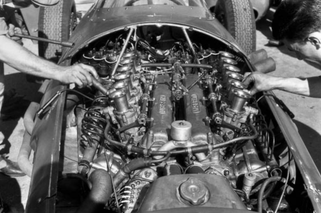 Since the beginning of 1958 Grand Prix engines have had to use a straight petrol of aviation category, rated at 130 octane, and the only reason for using this was a complete bungle on the part of the Commission Sportive International of the F.I.A. It was originally decreed that Grand Prix cars should use what the Paris congress described “pump fuel,” until someone asked them to define pump fuel and it was realised that no two pumps supplied the same fuel, and anyway, as Mr. Vandervell pointed out to the F.I.A., “the fuel that comes out of a pump depends on what you put in the tank.” A change of definition was made then to “100-octane petrol, as supplied to the public” but this was no good as a lot of European countries that intended to run Grand Prix races did not sell 100-octane petrol to the public. In desperation the F.I.A. searched about for some sort of straight petrol that was universal and available in all European countries, and of course, the only one they found was aviation petrol which was of 130 octane rating, so that was defined as the standard fuel for Grand Prix racing for 1958 and onwards.