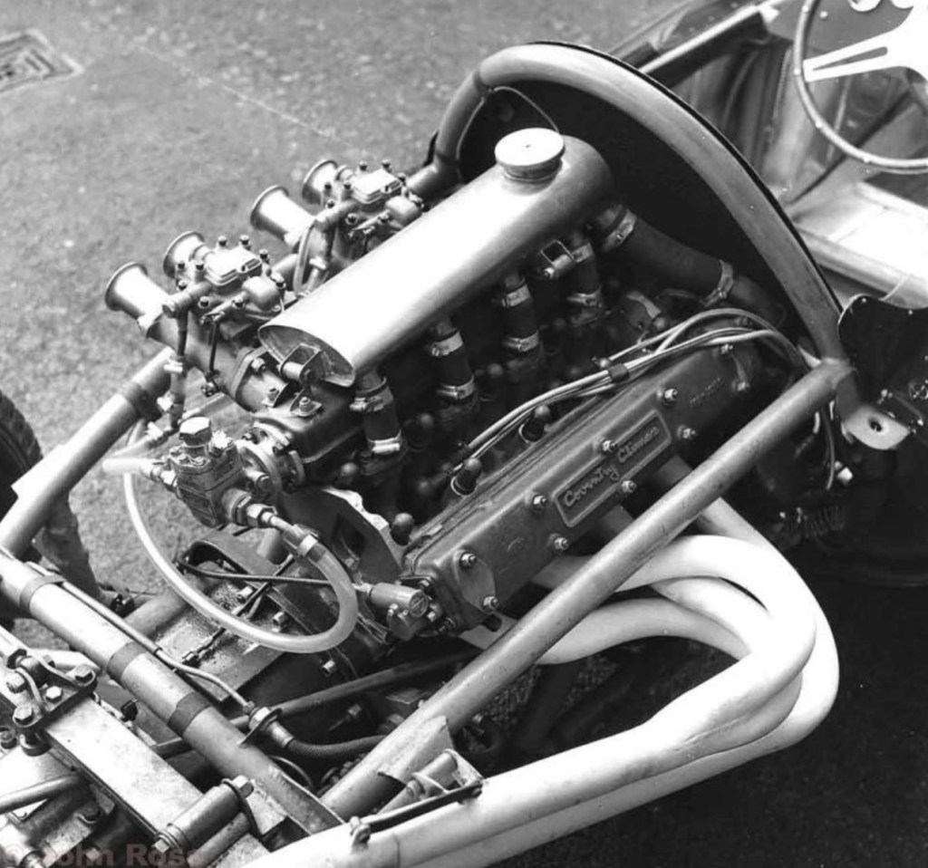 Originally conceived as a 1,500-c.c. engine for Formula 2 racing, which was introduced at the beginning of 1957, the FPF engine was contrived from pieces from the ill-fated 2,500-c.c. V8 Godiva engine built by the same firm. That engine was a complete failure for various reasons, and realising the need for an engine for Formula 2 racing Coventry-Climax used the cylinder head design from the Godiva and adapted it to a four-cylinder engine of 81.2 by 71.1 mm. bore and stroke. Being a commercial firm interested solely in selling engines, and having no direct connection with motor racing the FPF had to be designed and built to a definite price limit, unlike a pure Grand Prix engine, and in consequence it was sold as a 1,500-c.c. unit with a reasonable power output, but nothing phenomenal, nor was there anything particularly outstanding about the layout, having gear-driven twin-overhead camshafts and single sparking plugs to each cylinder, and using two double-choke carburetters.