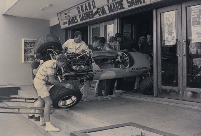 Alec Mildren Racing mechanics Bob Grange, in overalls, and Glenn Abbey partially obscured by the left front, manoeuvre their new Mildren (Rennmax) Alfa Romeo 1.6 F2 through the narrow front doors of the Avalon Cinema on Sydney’s Northern beaches.
