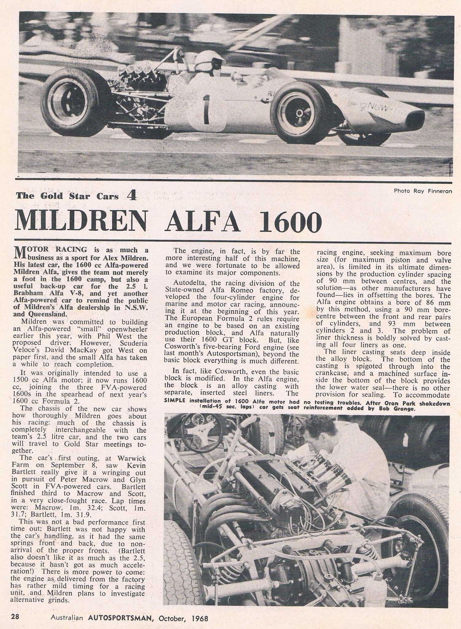 Upon further research it’s apparent just what a rare car the Mildren Alfa was for the short time of its existence. As indicated above, the Alfa Romeo F2 engine was replaced by Merv Waggott’s very first 1600 TC-4V engine for the first 1969 Gold Star round at Symmons Plains.