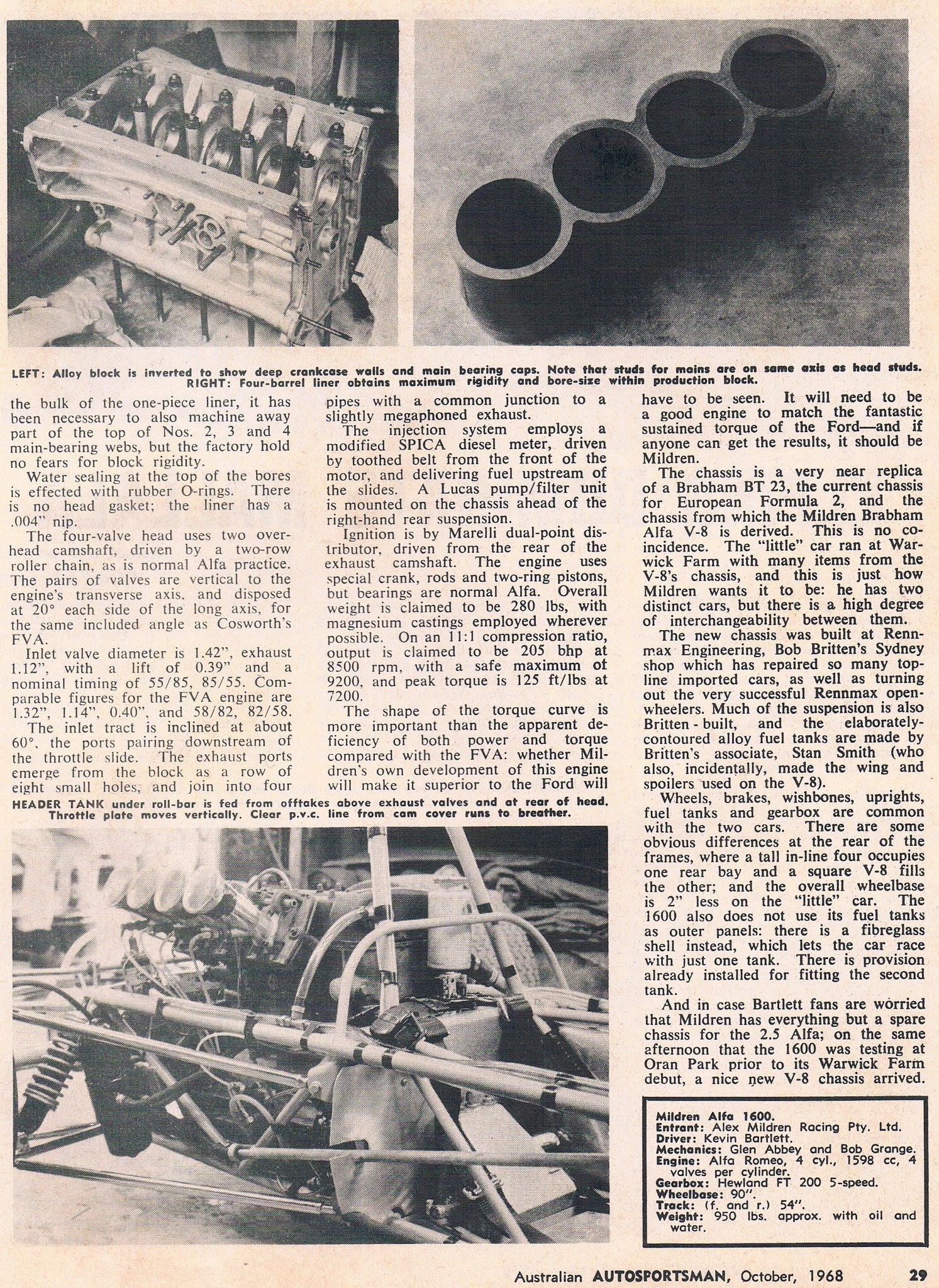 The article below on car and engine was published in the October 1968 issue of Australian Autosportsman and deals with the detail wonderfully well. I suspect it’s the best article on the planet on an extremely rare engine.