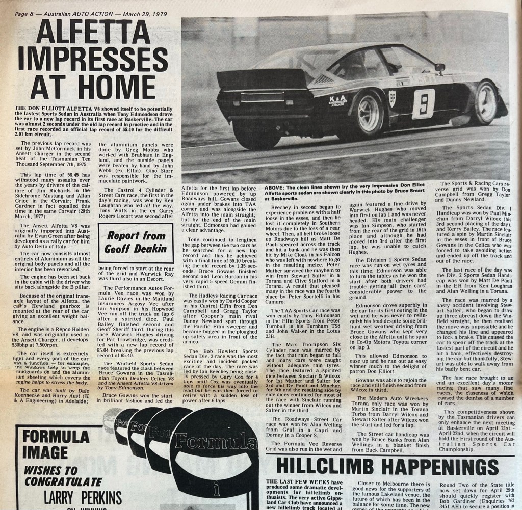 When Tony Edmondson’s ex-John McCormack Chrysler Valiant Charger Repco-Holden became uncompetitive he and Don Elliott engaged Adelaide’s K&A Engineering to build an Alfa Romeo Alfetta sports sedan in 1978.