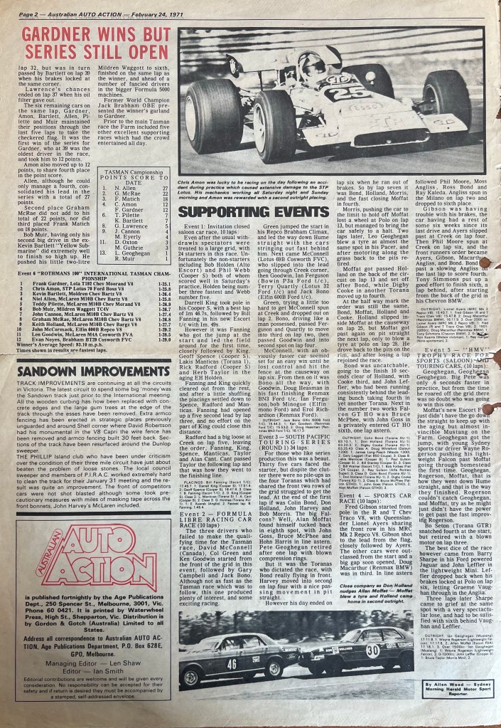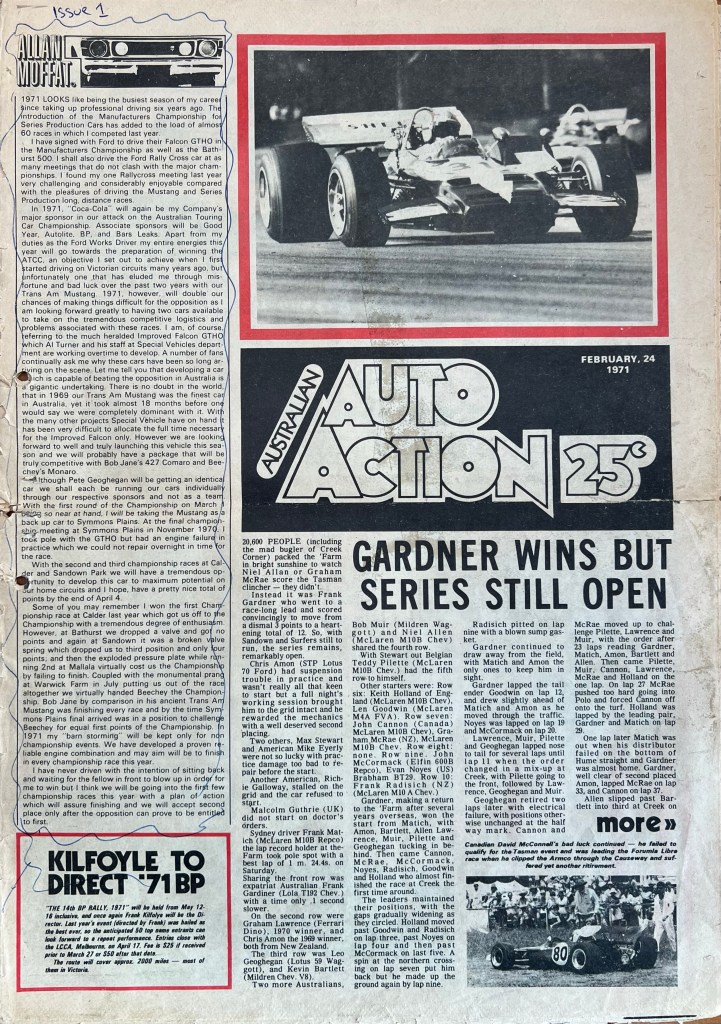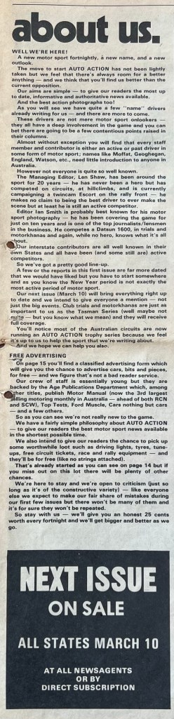 I’m not sure of the full content of that one yet, but my historic bits are a short piece on the museum, a ten-pager on the Tasman Cup from 1964-69. This is the first of two parts and has many ‘unseen’ photos taken by John Ellacott and Paul Cross. There is also an eight-page under-the-skin piece on Jim Richard’s Murray Bunn built Ford Falcon Hardtop Guney-Eagle 351 sports sedan. This one has Auto Action photos taken in the day that have never been published. It’s amazing what lurks in our files! Finally, Lord Alexander’s Hesketh outfit won its one and only championship F1 race, the Dutch Grand Prix in June 1975 . We have a two-page look at the unlikely but totally professional Peer, Bubbles Horsley, James Hunt and Harvey Postlethwaite.