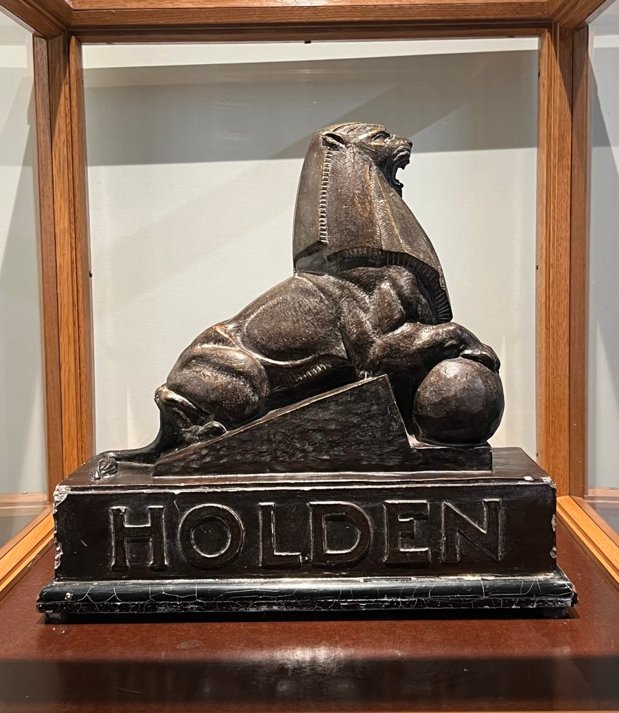 In the early 1920s Holden Motor Body Builders used a large brass plate embossed with a winged figure representing industry against a background of factory buildings. In 1926 the company decided to downsize the brass plate and emulate the practice of Fisher Body in the USA, which attached a neat replica of its coach trademark to the lower part of the cowl. Because the existing emblem was too detailed to be embossed on a small plate, a new design was commissioned to be based on the Egyptian-style ‘Wembley Lion’, symbol of London’s 1924-25 British Empire Exhibition. Fashion themes of the time from clothing to furniture, films and songs all were influenced by Egyptian antiquity.